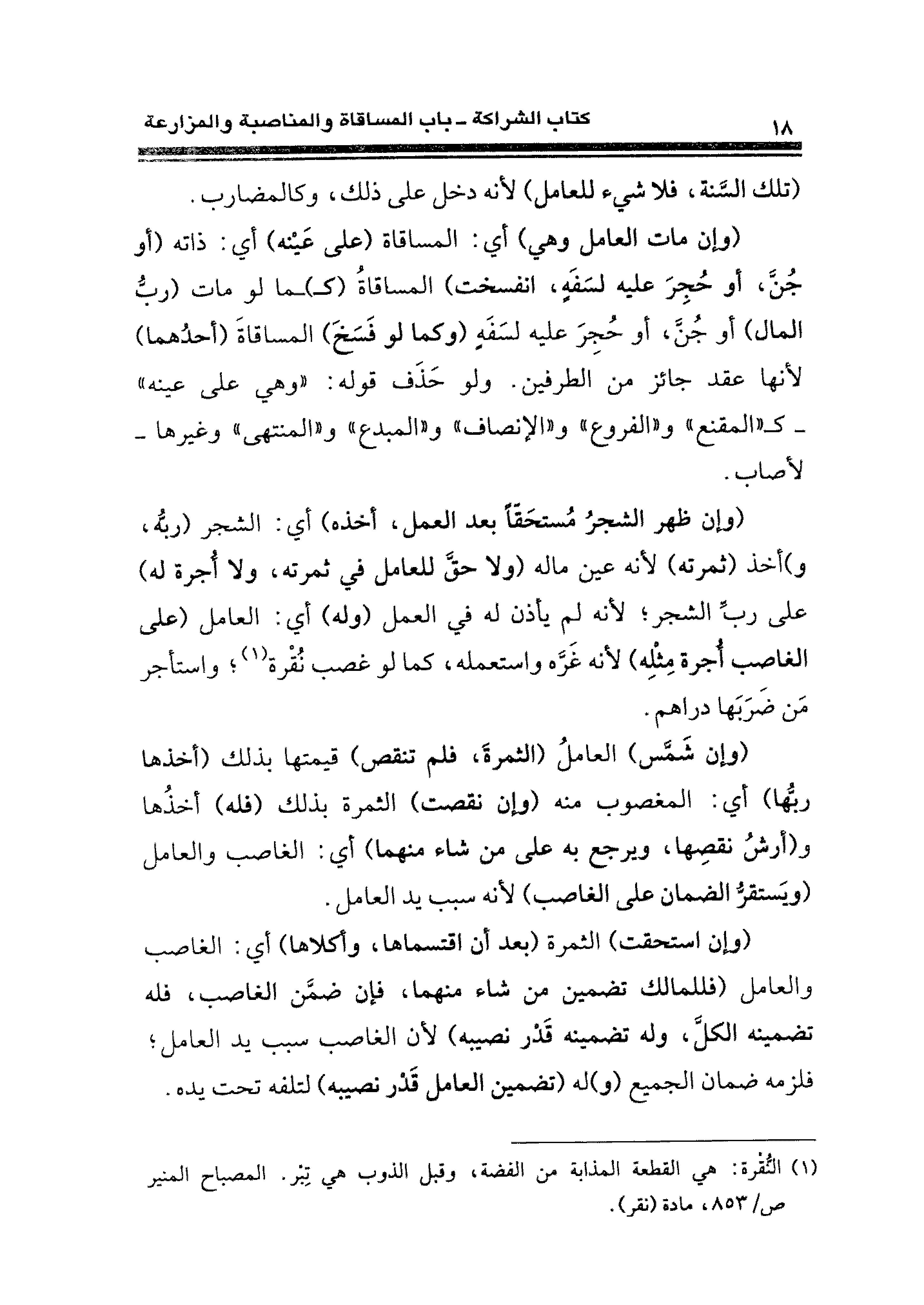 (وإن مات العامل وهي) أي: المساقاة (على عَيْنه) أي: ذاته (أو جُنَّ، أو حُجِرَ عليه لسَفَهٍ، انفسخت) المساقاةُ كـ) ـما لو مات (ربُّ المال) أو جُنَّ، أو حُجِرَ عليه لسَفَهٍ (وكما لو فَسَخ) المساقاةَ (أحدُهما) لأنها عقد جائز من الطرفين. ولو حَذَف قوله: "وهي على عينه" - كـ"المقنع" و "الفروع" و "الإنصاف" و"المبدع" و "المنتهى" وغيرها- لأصاب.
