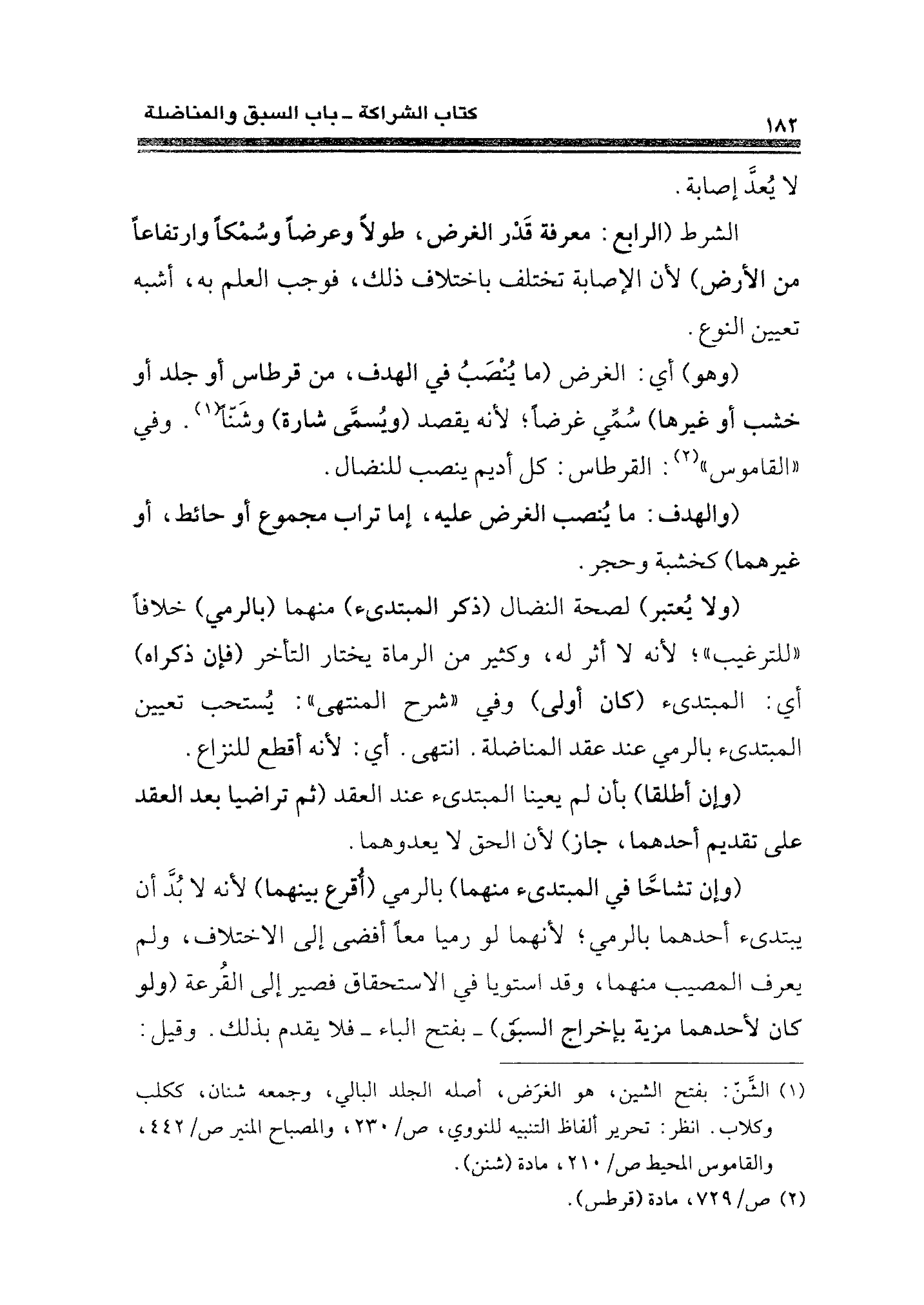 الشرط (الرابع: معرفة قَدْر الغرض، طولًا وعرضًا وسُمكًا وارتفاعًا من الأرض) لأن الإصابة تختلف باختلاف ذلك، فوجب العلم به، أشبه تعيين النوع.