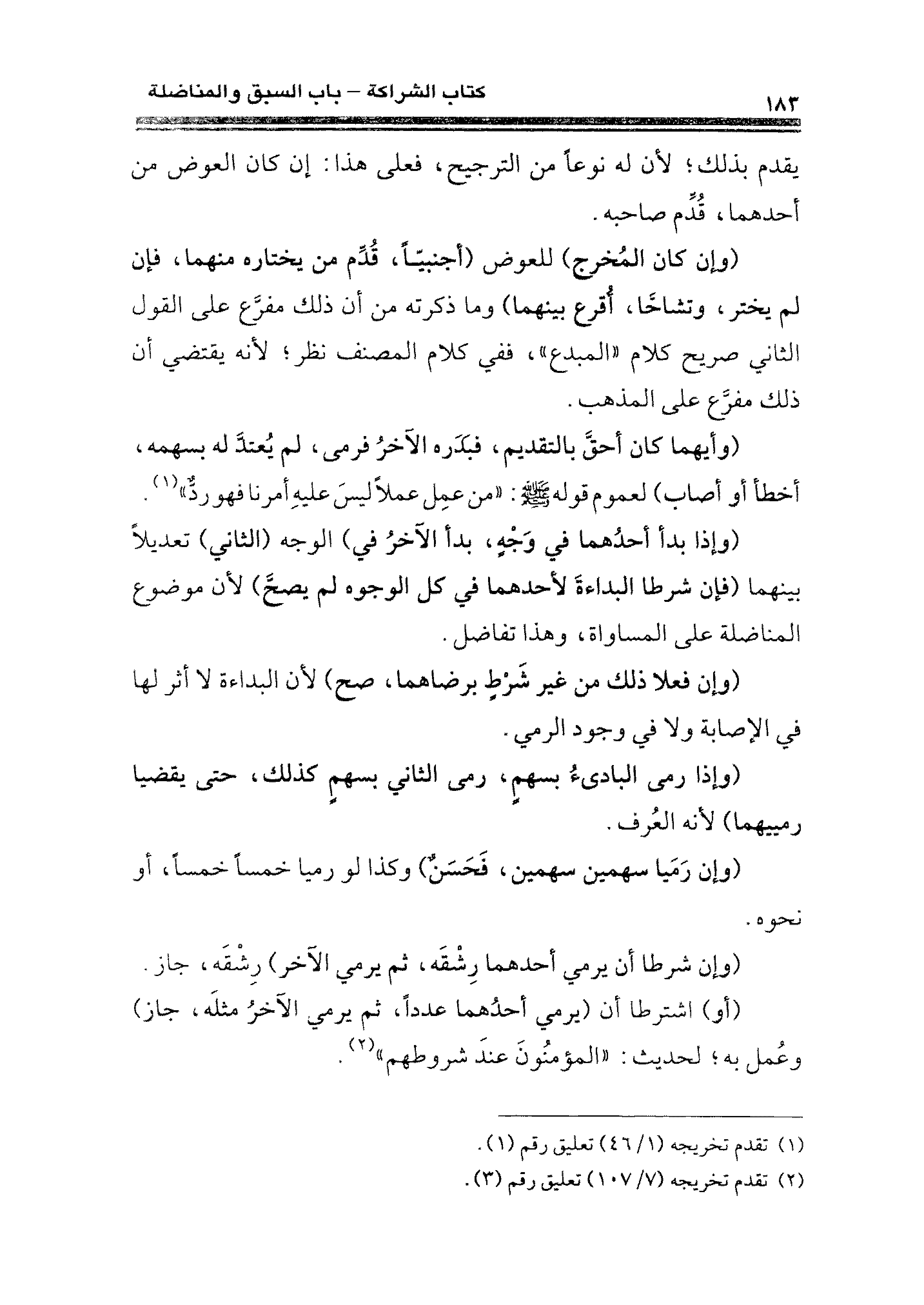 (وإذا بدأ أحدُهما في وَجْهٍ، بدأ الآخرُ في) الوجه (الثاني) تعديلًا بينهما (فإن شرطا البداءةَ لأحدهما في كل الوجوه لم يصح) لأن موضوع المناضلة على المساواة، وهذا تفاضل.