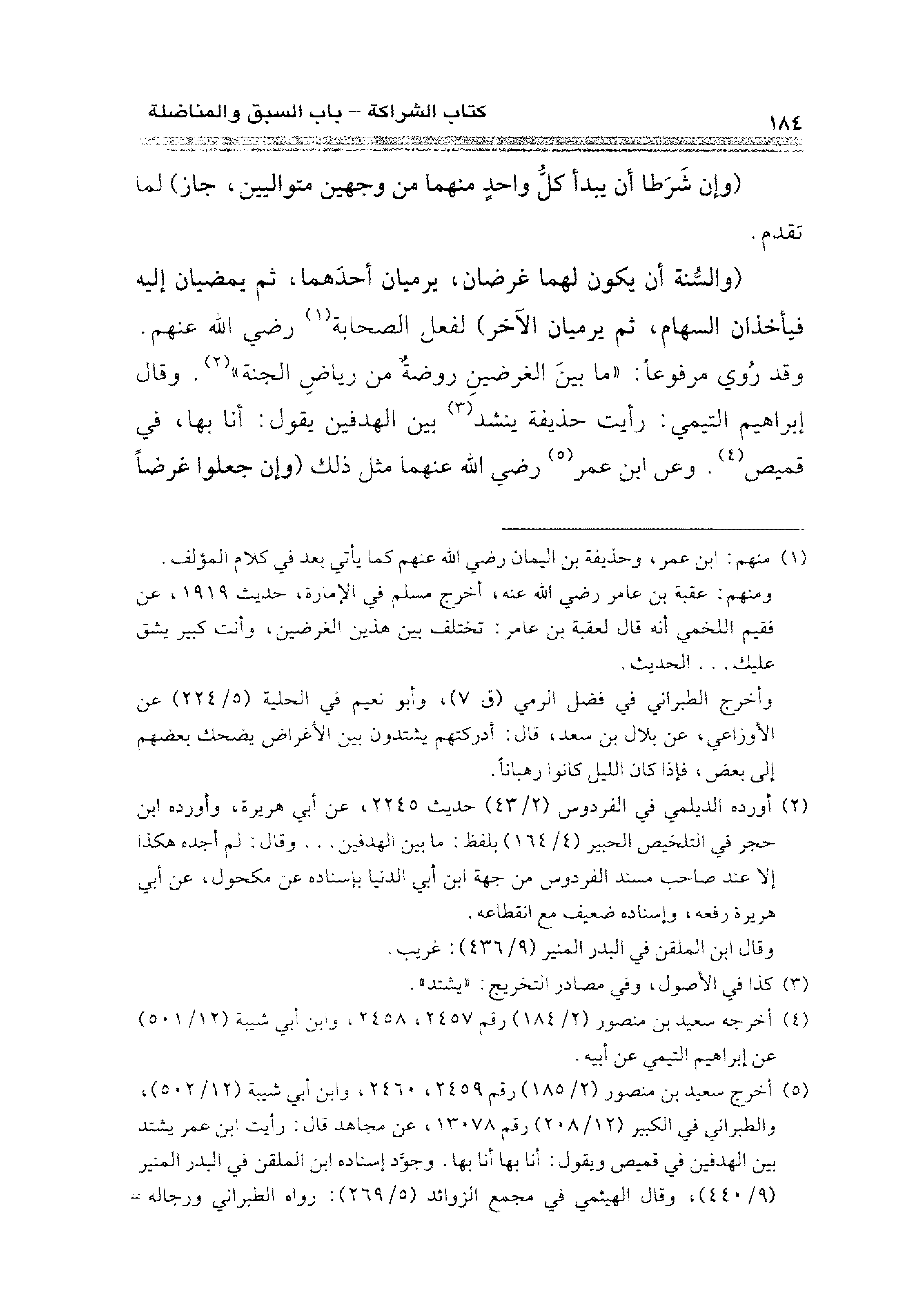 (والسُّنة أن يكون لهما غرضان، يرميان أحدَهما، ثم يمضيان إليه فيأخذان السهام، ثم يرميان الآخر) لفعل الصحابة (¬١) رضي الله عنهم. وقد رُوي مرفوعًا: "ما بينَ الغرضين روضةٌ من رياضِ الجنة" (¬٢). وقال إبراهيم التيمي: رأيت حذيفة ينشد (¬٣) بين الهدفين يقول: أنا بها، في قميص (¬٤). وعن ابن عمر (¬٥) رضي الله عنهما مثل ذلك (وإن جعلوا غرضًا