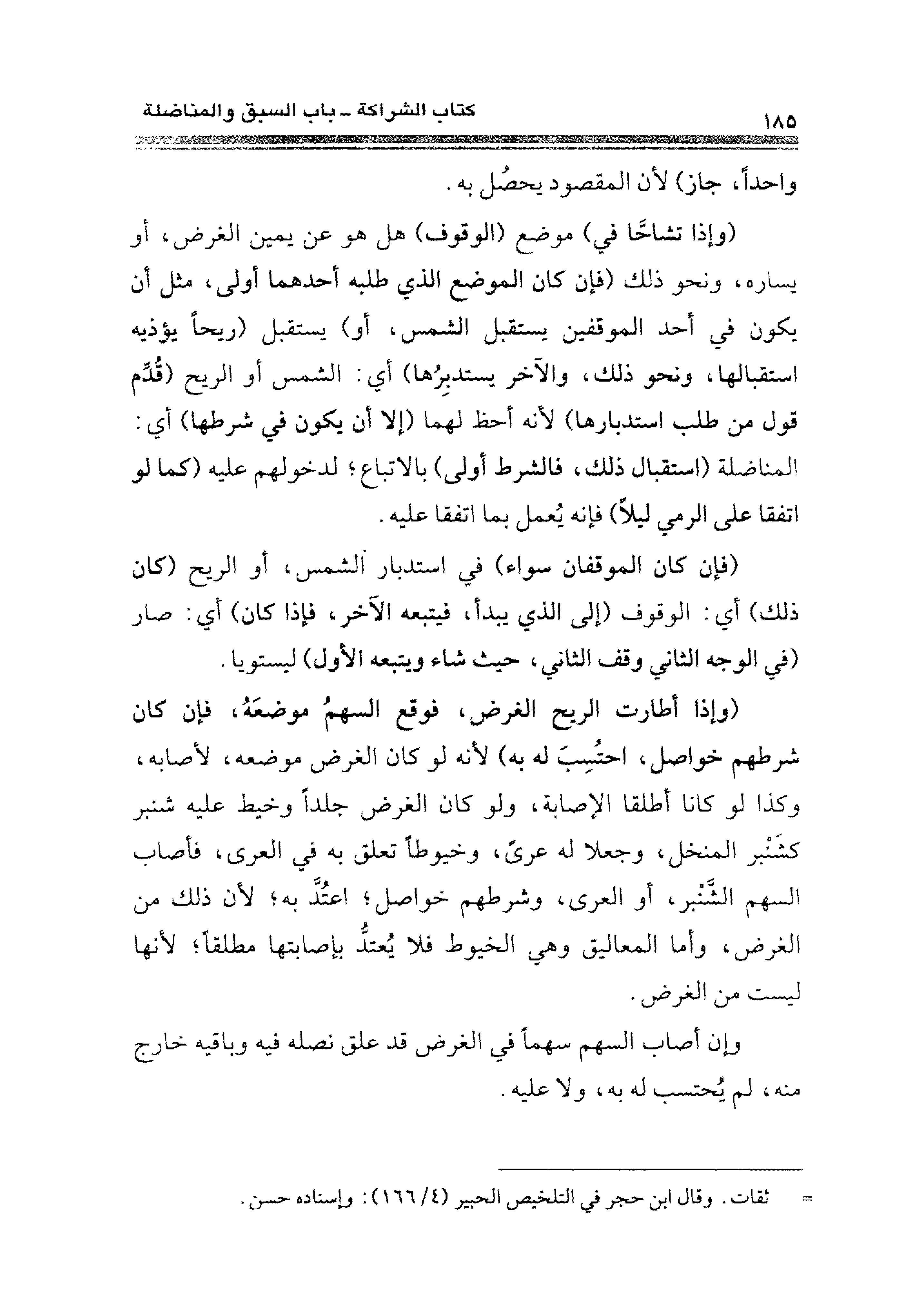 (وإذا تشاحَّا في) موضع (الوقوف) هل هو عن يمين الغرض، أو يساره، ونحو ذلك (فإن كان الموضع الذي طلبه أحدهما أولى، مثل أن يكون في أحد الموقفين يستقبل الشمس، أو) يسقبل (ريحًا يؤذيه اسقبالها، ونحو ذلك، والآخر يستدبِرُها) أي: الشمس أو الريح (قُدِّم قول من طلب استدبارها) لأنه أحظ لهما (إلا أن يكون في شرطها) أي: المناضلة (استقبال ذلك، فالشرط أولى) بالاتباع، لدخولهم عليه (كما لو اتفقا على الرمي ليلًا) فإنه يُعمل بما اتفقا عليه.