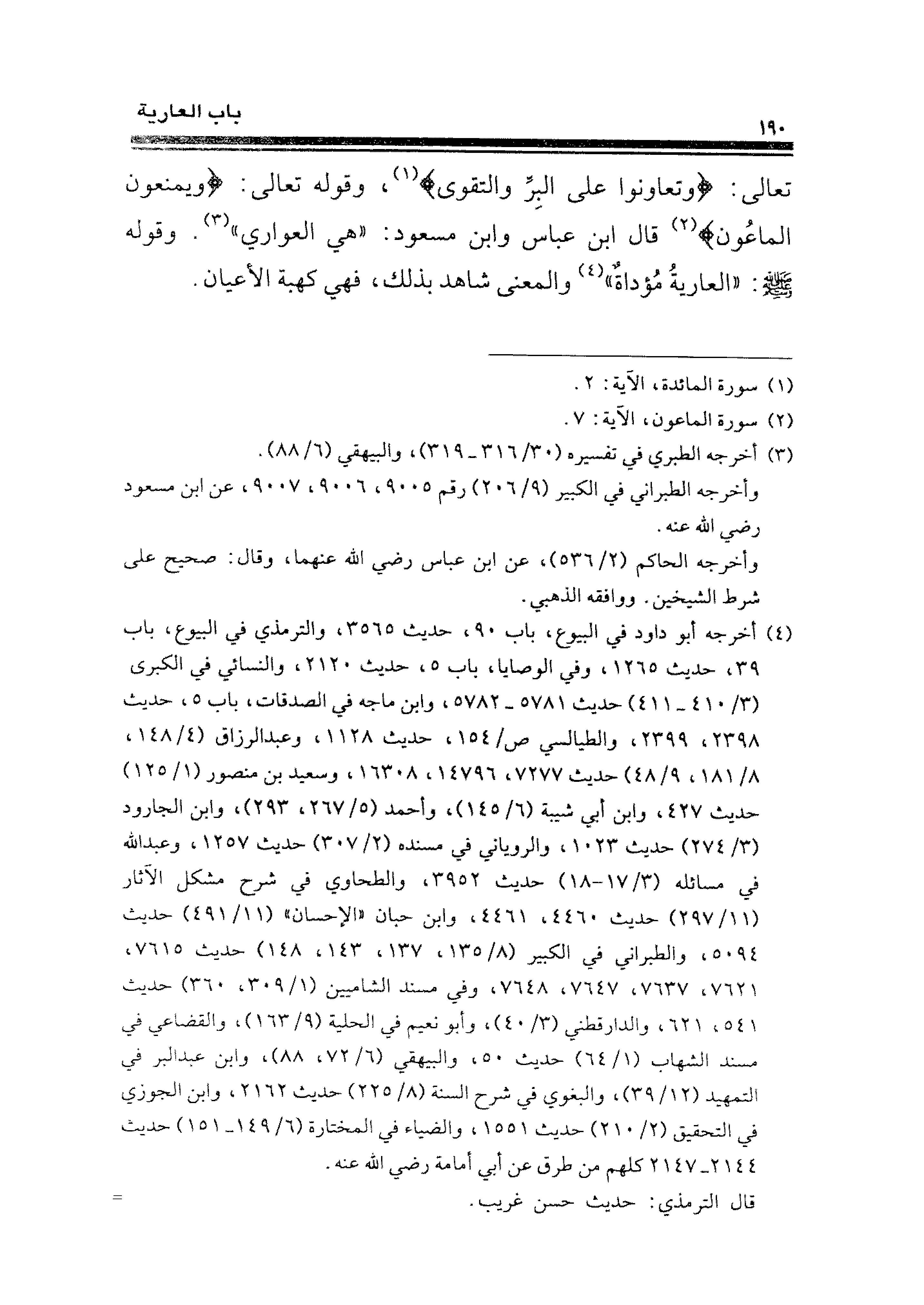 تعالى: {وتعاونوا على البِرِّ والتقوى} (¬١)، وقوله تعالى: {ويمنعون الماعُون} (¬٢) قال ابن عباس وابن مسعود: "هي العواري" (¬٣). وقوله - صلى الله عليه وسلم -: "العاريةُ مُؤداةٌ" (¬٤) والمعنى شاهد بذلك، فهي كهبة الأعيان.