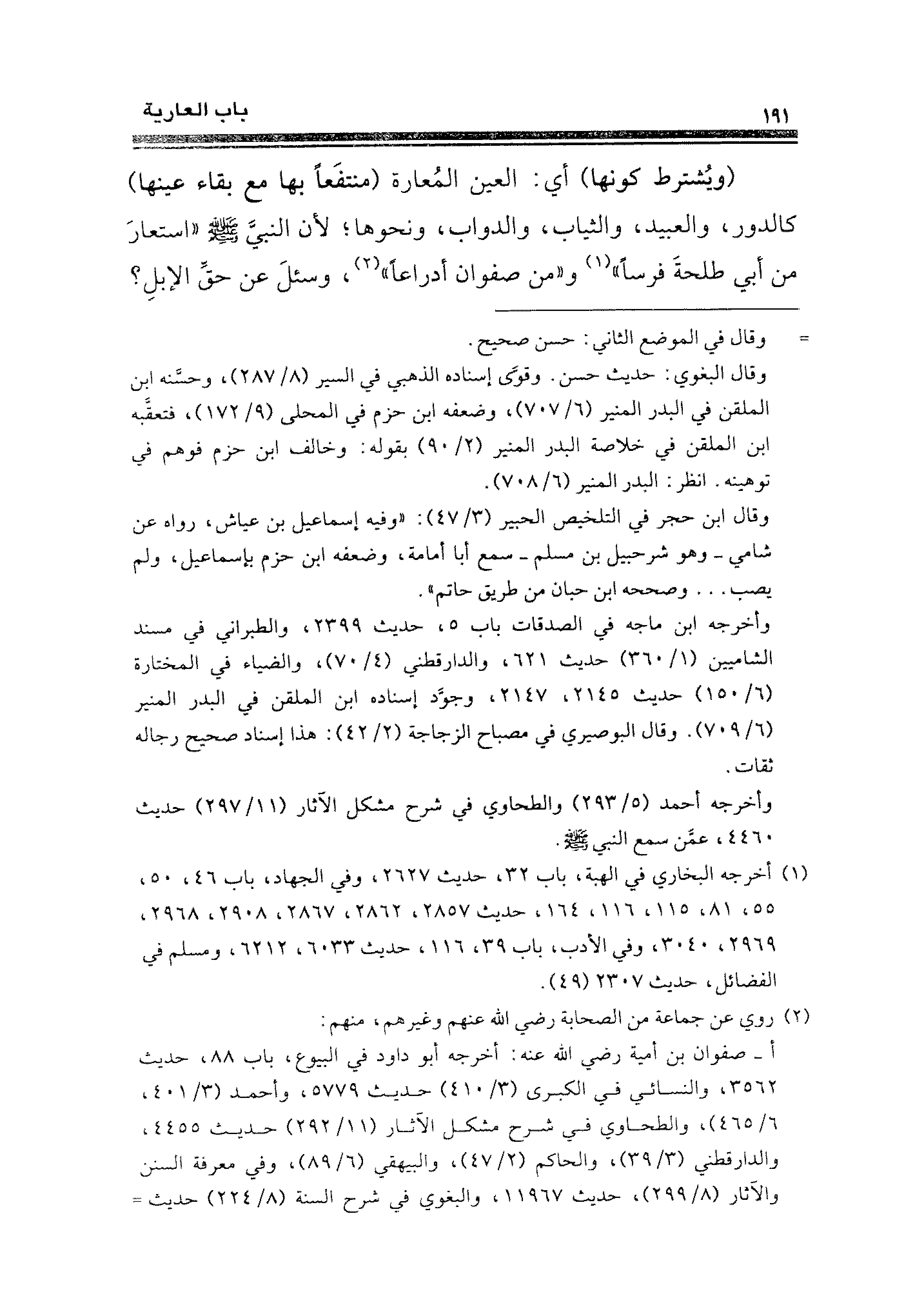 (ويُشترط كونها) أي: العين المُعارة (منتفَعًا بها مع بقاء عينها) كالدور، والعبيد، والثياب، والدواب، ونحوها؛ لأن النبيَّ - صلى الله عليه وسلم - "استعارَ من أبي طلحةَ فرسًا" (¬١) و"من صفوان أدراعًا (¬٢)، وسئلَ عن حقِّ الإبلِ؟