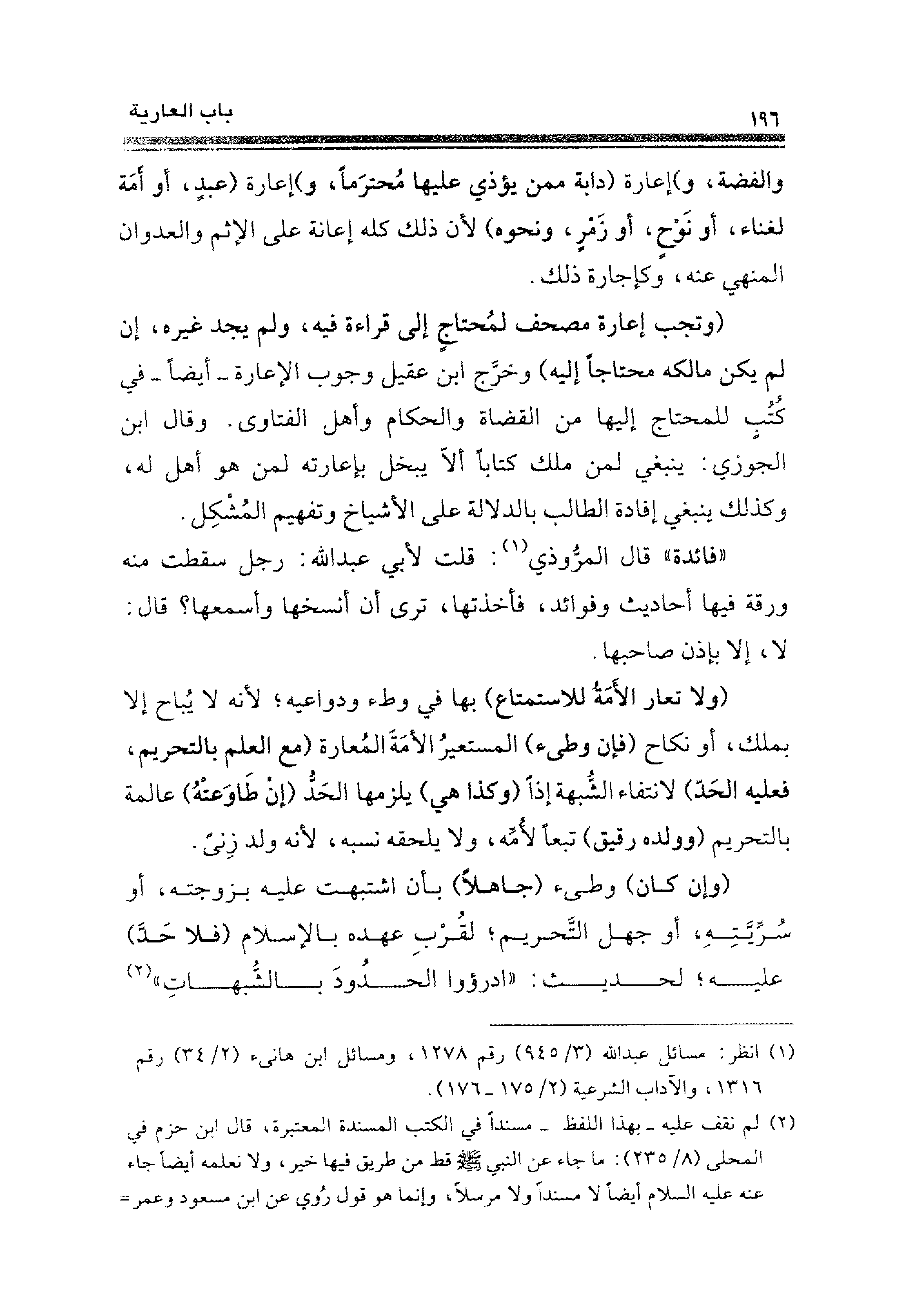 (وتجب إعارة مصحف لمُحتاجٍ إلى قراءة فيه، ولم يجد غيره، إن لم يكن مالكه محتاجًا إليه) وخرَّج ابن عقيل وجوب الإعارة -أيضًا- في كُتُبٍ للمحتاج إليها من القضاة والحكام وأهل الفتاوى. وقال ابن الجوزي: ينبغي لمن ملك كتابًا إلَّا يبخل بإعارته لمن هو أهل له، وكذلك ينبغي إفادة الطالب بالدلالة على الأشياخ وتفهيم المُشكِل.