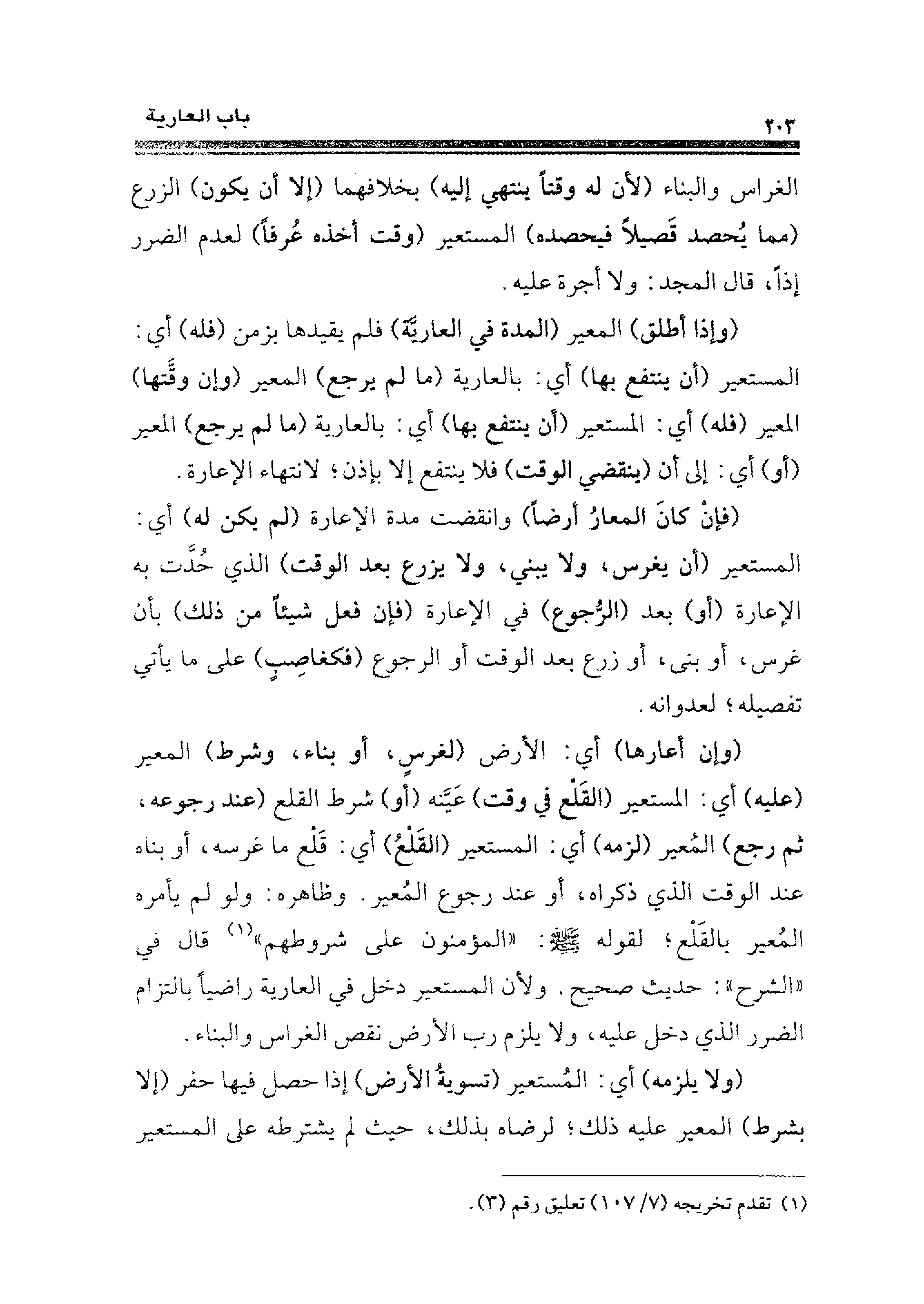 (وإن أعارها) أي: الأرض (لغرسٍ؛ أو بناء، وشرط) المعير (عليه) أي: المستعير (القَلْع في وقت) عَيَّنه (أو) شرط القلع (عند رجوعه، ثم رجع) المُعير (لزمه) أي: المستعير (القَلْعُ) أي: قَلْع ما غرسه، أو بناه عند الوقت الذي ذكراه، أو عند رجوع المُعير. وظاهره: ولو لم يأمره المُعير بالقلْع؛ لقوله - صلى الله عليه وسلم -: "المؤمنون على شروطهم" (¬١) قال في "الشرح": حديث صحيح. ولأن المستعير دخل في العارية راضيًا بالتزام الضرر الذيِ دخل عليه، ولا يلزم رب الأرض نقص الغراس والبناء.
