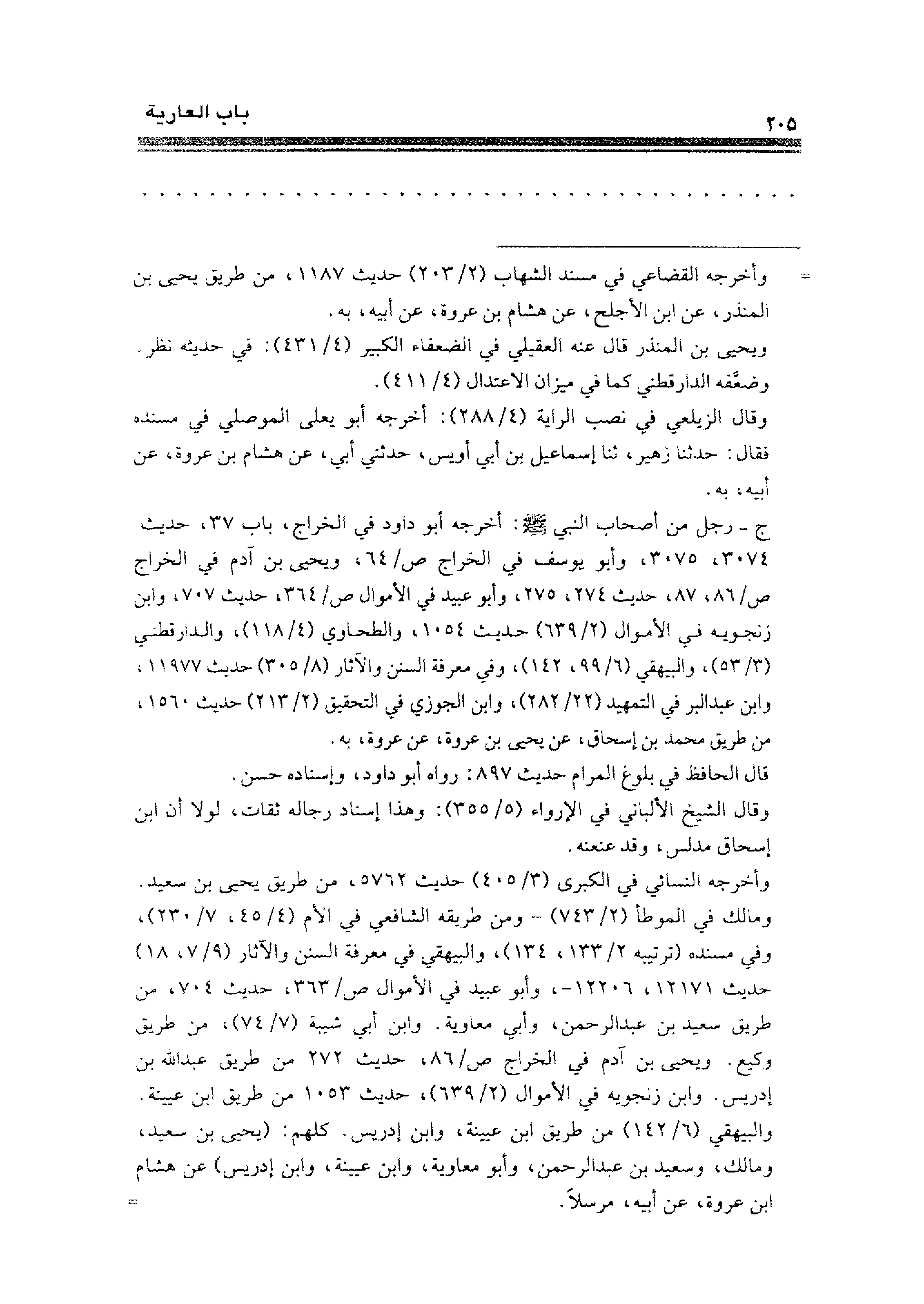 ج- رجل من أصحاب النبي - صلى الله عليه وسلم -: أخرجه أبو داود في الخراج، باب ٣٧، حديث ٣٠٧٤، ٣٠٧٥، وأبو يوسف في الخراج ص / ٦٤، ويحيى بن آدم في الخراج ص / ٨٦، ٨٧، حديث ٢٧٤، ٢٧٥، وأبو عبيد في الأموال ص / ٣٦٤، حديث ٧٠٧، وابن زنجويه في الأموال (٢/ ٦٣٩) حديث ١٠٥٤، والطحاوي (٤/ ١١٨)، والدارقطني (٣/ ٥٣)، والبيهقي (٦/ ٩٩، ١٤٢)، وفي معرفة السنن والآثار (٨/ ٣٠٥) حديث ١١٩٧٧، وابن عبد البر في التمهيد (٢٢/ ٢٨٢)، وابن الجوزي في التحقيق (٢/ ٢١٣) حديث ١٥٦٠، من طريق محمد بن إسحاق، عن يحيى بن عروة، عن عروة، به.