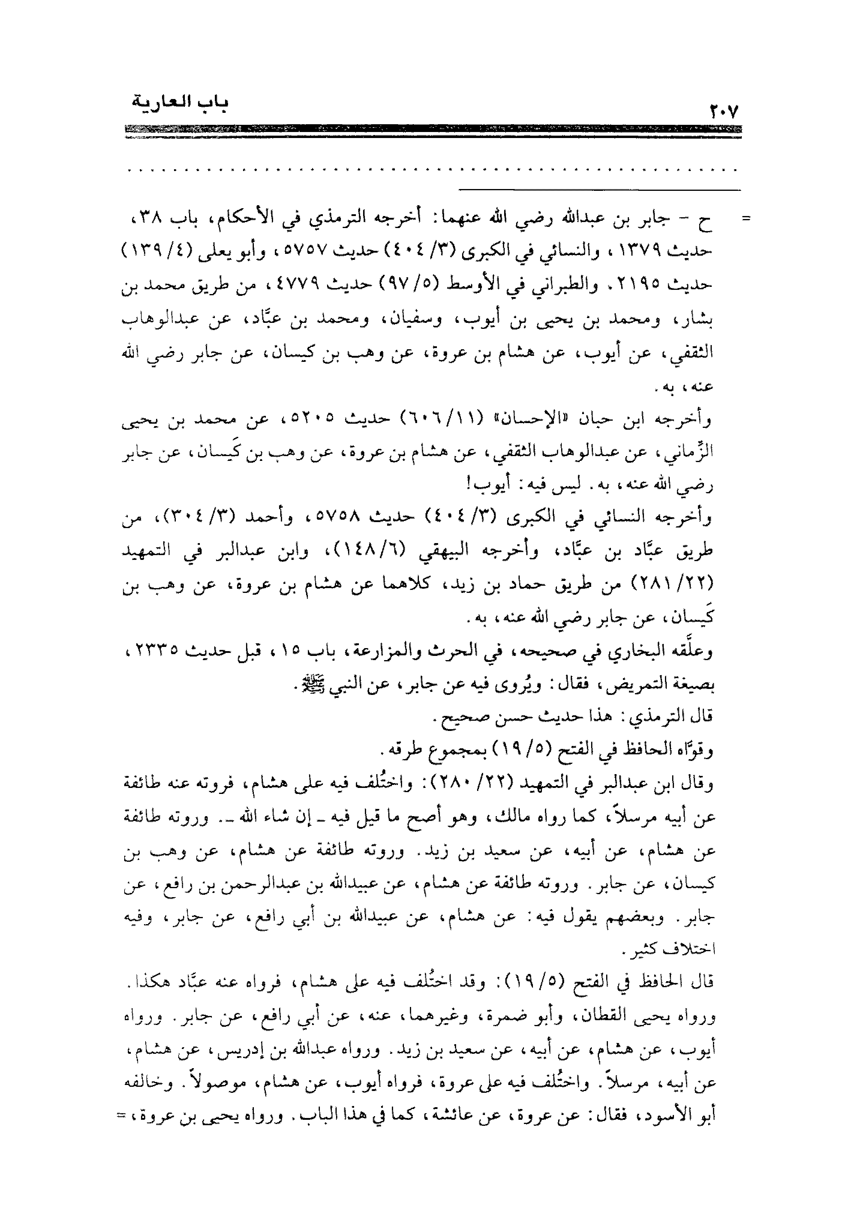 = ح - جابر بن عبد الله رضي الله عنهما: أخرجه الترمذي في الأحكام، باب ٣٨، حديث ١٣٧٩، والنسائي في الكبرى (٣/ ٤٠٤) حديث ٥٧٥٧، وأبو يعلى (٤/ ١٣٩) حديث ٢١٩٥، والطبراني في الأوسط (٥/ ٩٧) حديث ٤٧٧٩، عن طريق محمد بن بشار، ومحمد بن يحيى بن أيوب، وسفيان، ومحمد بن عبَّاد، عن عبد الوهاب الثقفي، عن أيوب، عن هشام بن عروة، عن وهب بن كيسان، عن جابر رضي الله عنه، به.