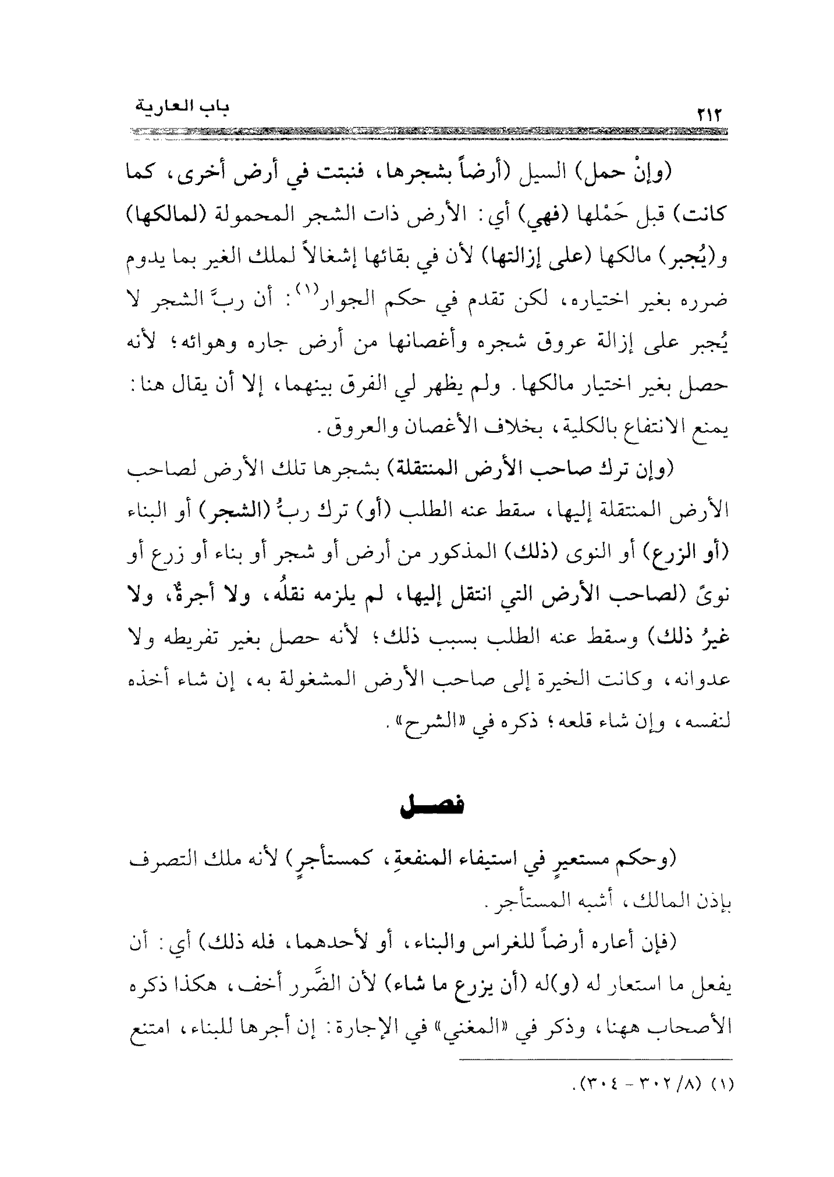 (وإنْ حمل) السيل (أرضًا بشجرها، فنبتت في أرض أخرى، كما كانت) قبل حَمْلها (فهي) أي: الأرض ذات الشجر المحمولة (لمالكها) و (يُجبر) مالكها (على إزالتها) لأن في بقائها إشغالًا لملك الغير بما يدوم ضرره بغير اختياره، لكن تقدم في حكم الجوار (¬١): أن ربَّ الشجر لا يُجبر على إزالة عروق شجره وأغصانها من أرض جاره وهوائه؛ لأنه حصل بغير اختيار مالكها. ولم يظهر لي الفرق بينهما، إلا أن يقال هنا: يمنع الانتفاع بالكلية، بخلاف الأغصان والعروق.