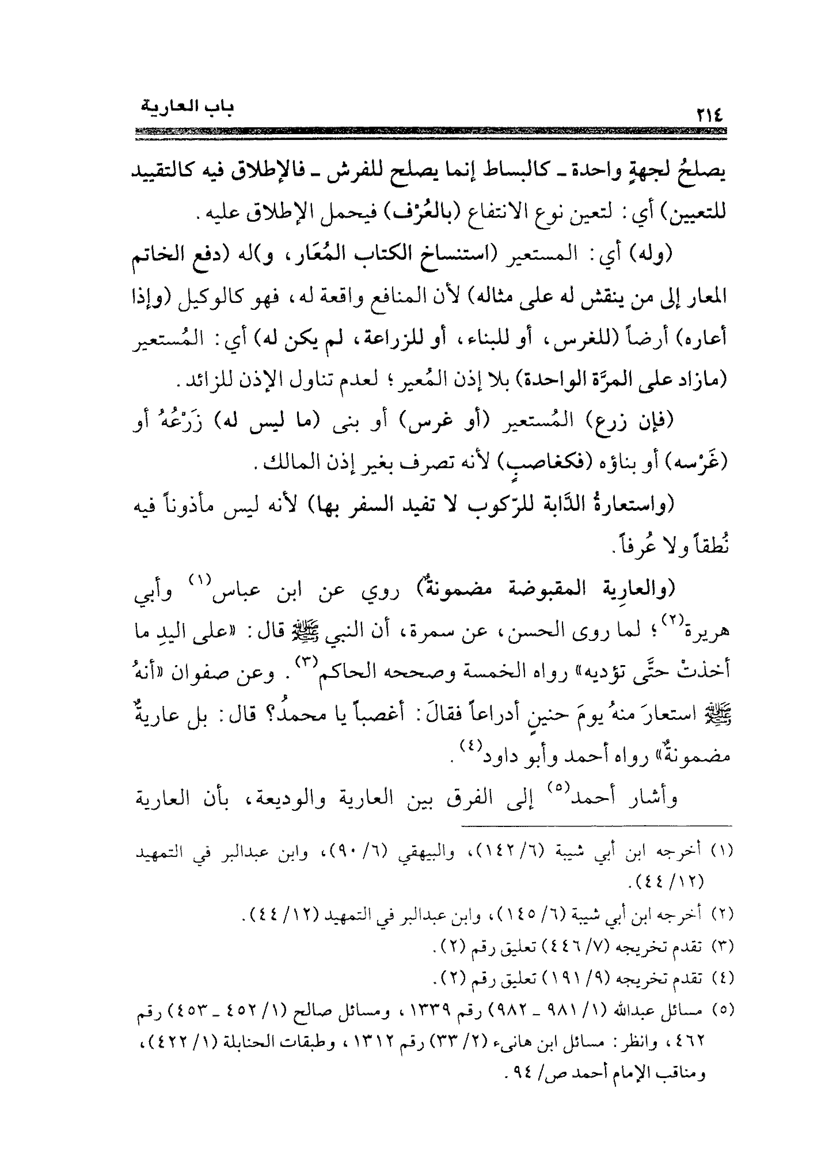 (والعارِية المقبوضة مضمونةٌ) روي عن ابن عباس (¬١) وأبي هريرة (¬٢)؛ لما روى الحسن، عن سمرة، أن النبي - صلى الله عليه وسلم - قال: "على اليدِ ما أخذتْ حتَّى تؤديه" رواه الخمسة وصححه الحاكم (¬٣). وعن صفوان "أنهُ - صلى الله عليه وسلم - استعارَ عنهُ يومَ حنينٍ أدراعًا فقال: أغصبًا يا محمدُ؟ قال: بل عاريةٌ مضمونةٌ" رواه أحمد وأبو داود (¬٤).