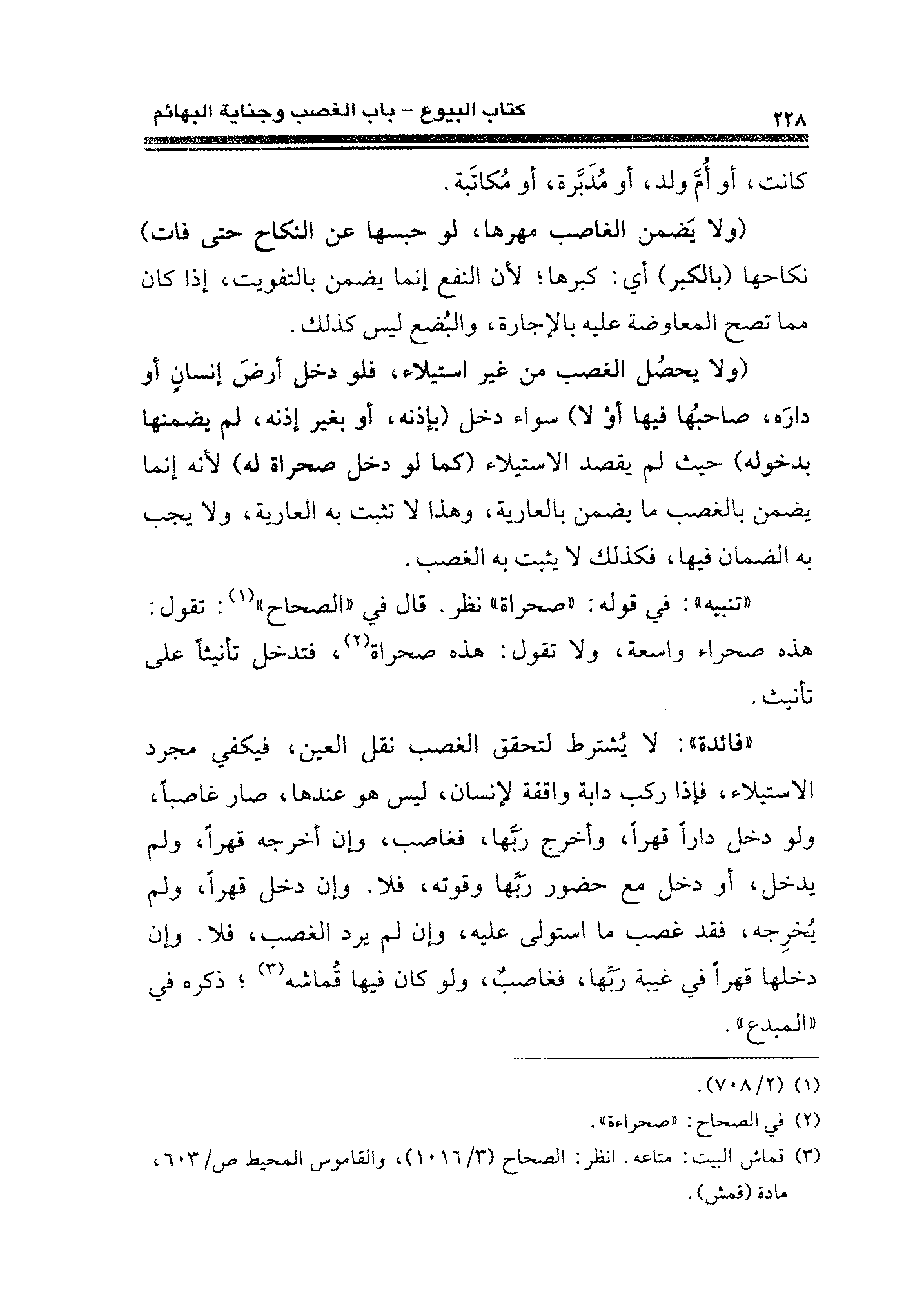 "فائدة": لا يُشترط لتحقق الغصب نقل العين، فيكفي مجرد الاستيلاء، فإذا ركب دابة واقفة لإنسان، ليس هو عندها، صار غاصبًا، ولو دخل دارًا قهرًا، وأخرج رَبَّها، فغاصب، وإن أخرجه قهرًا، ولم يدخل، أو دخل مع حضور رَبِّها وقوته، فلا. وإن دخل قهرًا، ولم يُخرِجه، فقد غصب ما استولى عليه، وإن لم يرد الغصب، فلا. وإن دخلها قهرًا في غيبة رَبِّها، فغاصبٌ، ولو كان فيها قُماشه (¬٣)؛ ذكره في "المبدع".