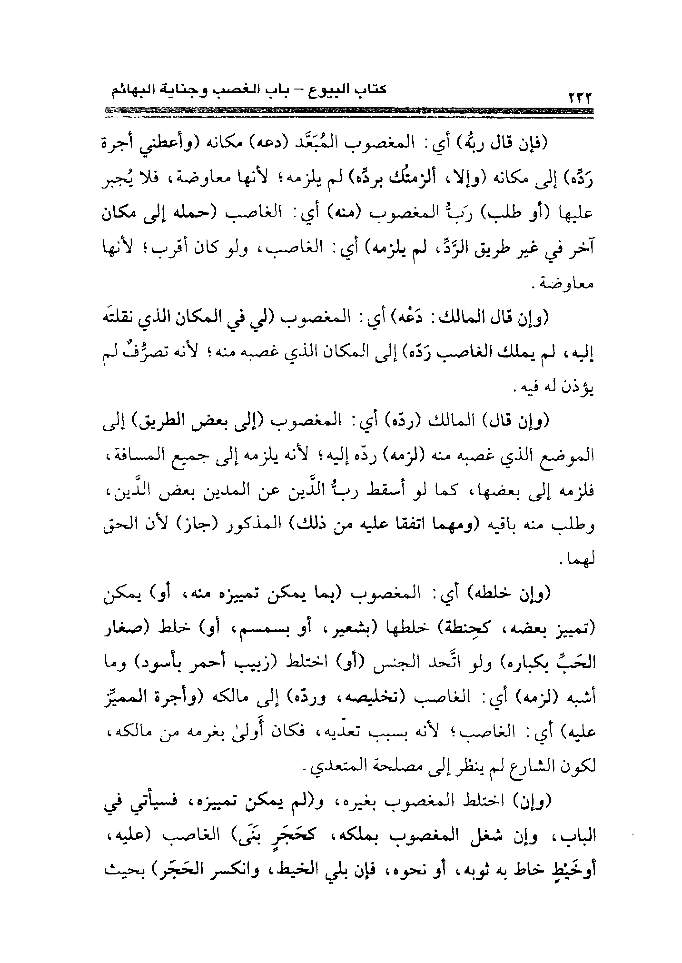 (وإن) اختلط المغصوب بغيره، و (لم يمكن تمييزه، فسيأتي في الباب، وإن شغل المغصوب بملكه، كحَجَرٍ بَنَى) الغاصب (عليه، أو خَيْطٍ خاط به ثوبه، أو نحوه، فإن بلي الخيط، وانكسر الحَجَر) بحيث