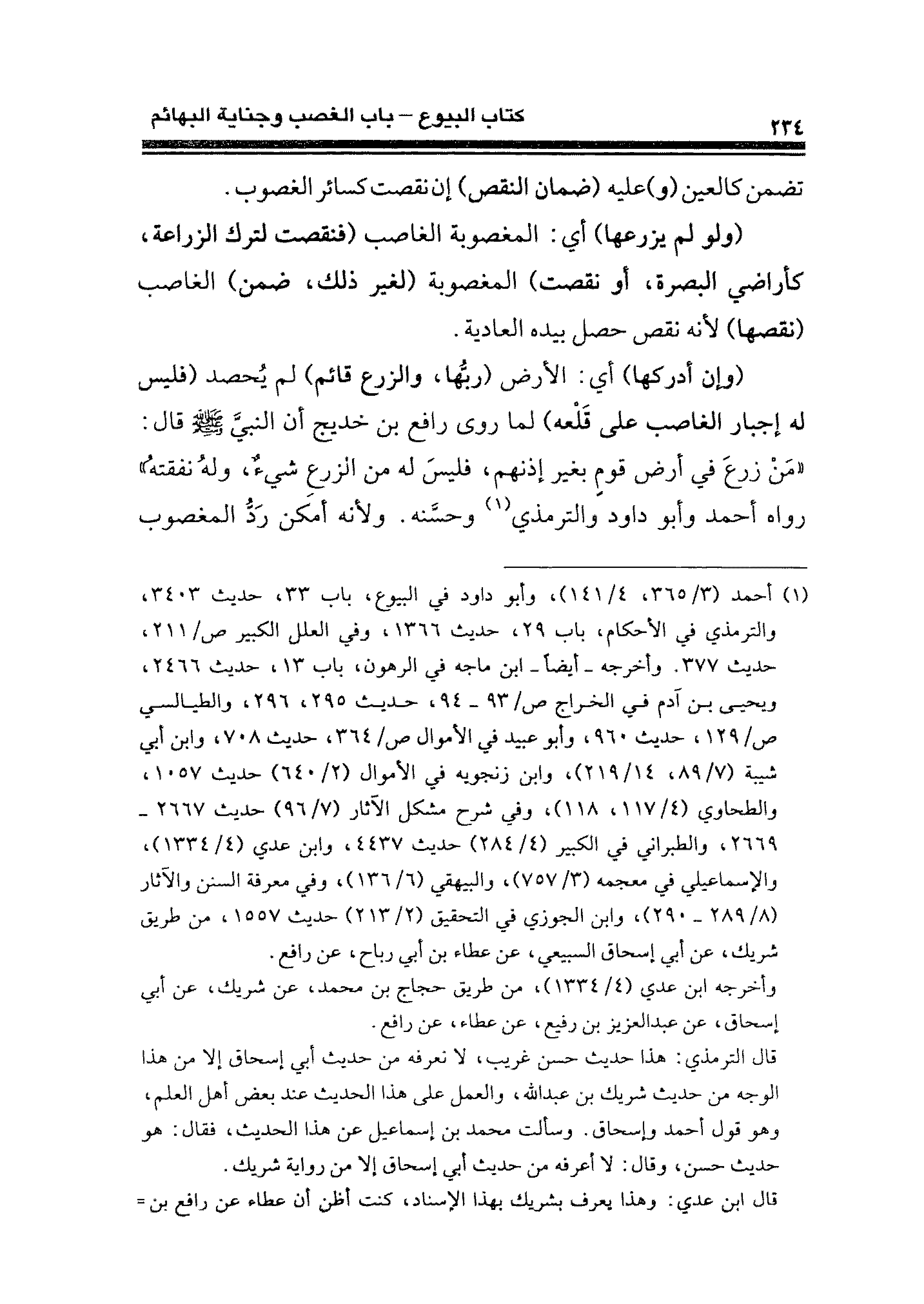 (¬١) أحمد (٣/ ٣٦٥، ٤/ ١٤١)، وأبو داود في البيوع، باب ٣٣، حديث ٣٤٠٣، والترمذي فى الأحكام، باب ٢٩، حديث ١٣٦٦، وفي العلل الكبير ص / ٢١١، حديث ٣٧٧. وأخرجه -أيضًا- ابن ماجه في الرهون، باب ١٣، حديث ٢٤٦٦، ويحيى بن آدم في الخراج ص/٩٣ - ٩٤، حديث ٢٩٥، ٢٩٦، والطيالسي ص/ ١٢٩، حديث ٩٦٠، وأبو عبيد في الأموال ص/ ٣٦٤، حديث ٧٠٨، وابن أبي شيبة (٧/ ٨٩، ١٤/ ٢١٩)، وابن زنجويه في الأموال (٢/ ٦٤٠) حديث ١٠٥٧، والطحاوي (٤/ ١١٧، ١١٨)، وفي شرح مشكل الآثار (٧/ ٩٦) حديث ٢٦٦٧ - ٢٦٦٩، والطبراني في الكبير (٤/ ٢٨٤) حديث ٤٤٣٧، وابن عدي (٤/ ١٣٣٤)، والإسماعيلي في معجمه (٣/ ٧٥٧)، والبيهقي (٦/ ١٣٦)، وفي معرفة السنن والآثار (٨/ ٢٨٩ - ٢٩٠)، وابن الجوزي في التحقيق (٢/ ٢١٣) حديث ١٥٥٧، من طريق شريك، عن أبي إسحاق السبيعي، عن عطاء بن أبي رباح، عن رافع.