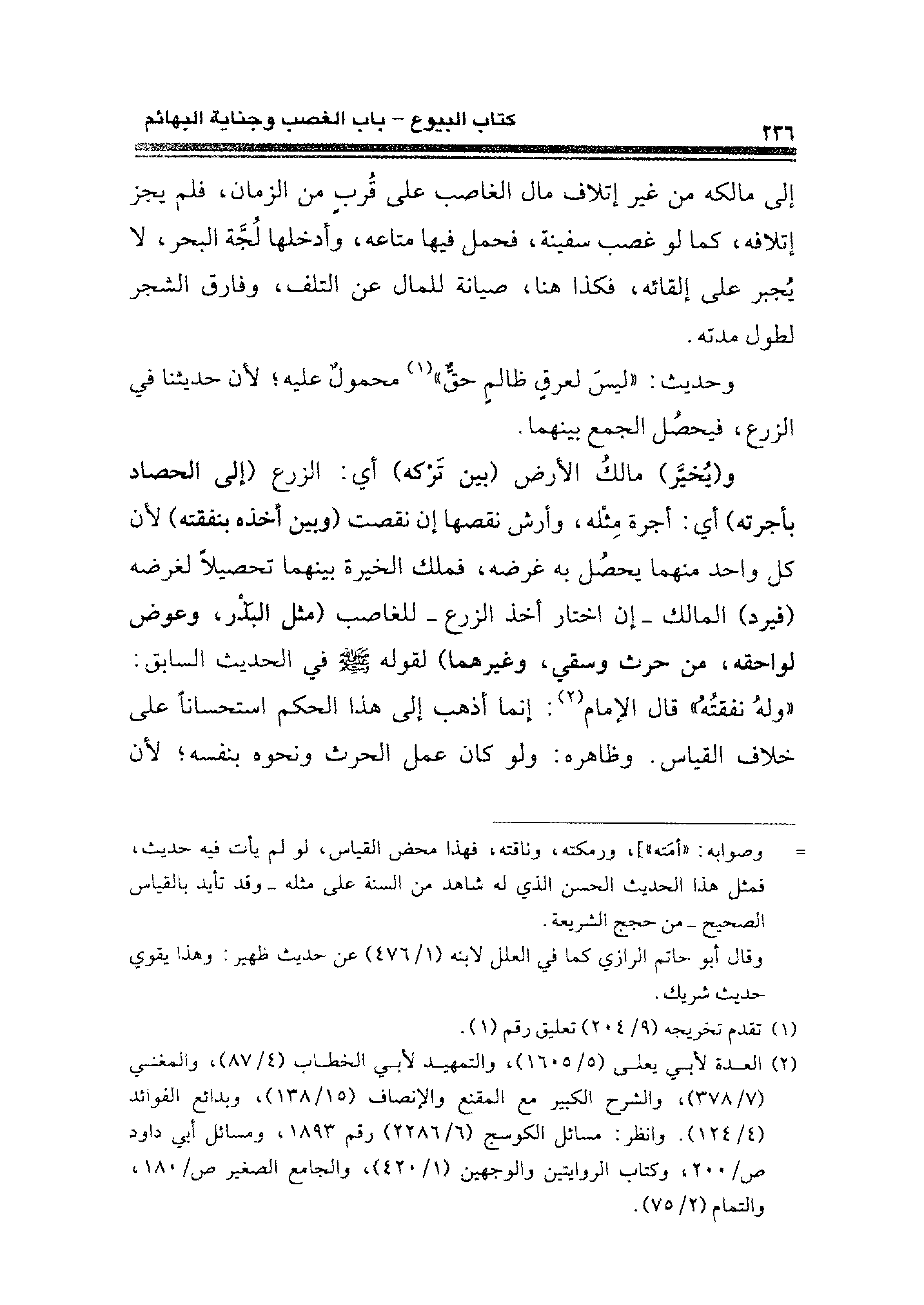 وحديث: "ليسَ لعرقٍ ظالمٍ حقٌّ" (¬١) محمولٌ عليه؛ لأن حديثنا في الزرع، فيحصُل الجمع بينهما.