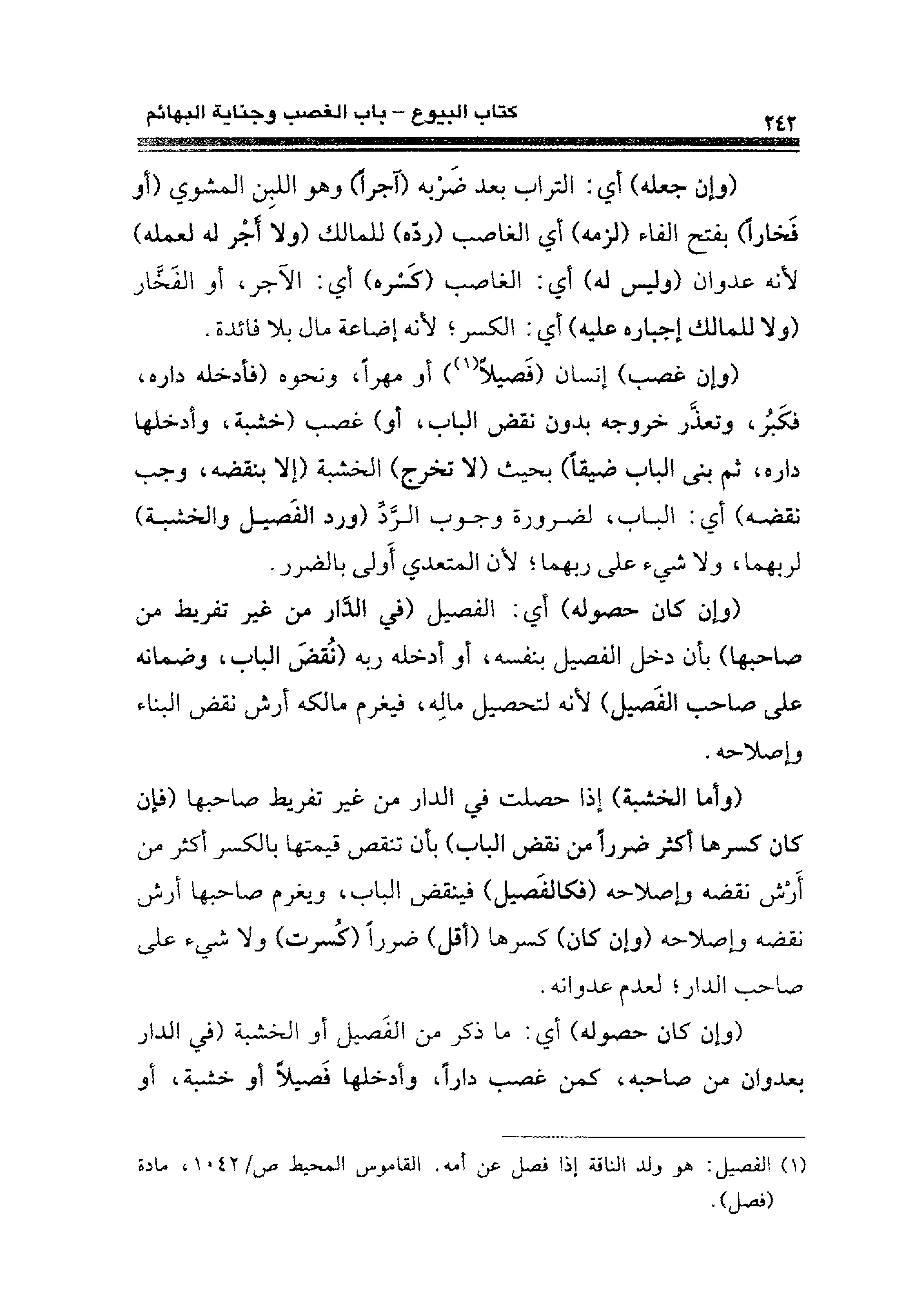 (وإن كان حصوله) أي: الفصيل. (في الدَّار من غير تفريط من صاحبها) بأن دخل الفصيل بنفسه، أو أدخله ربه (نُقضَ الباب، وضمانه على صاحب الفَصيل) لأنه لتحصيل مالِه، فيغرم مالكه أرش نقض البناء وإصلاحه.