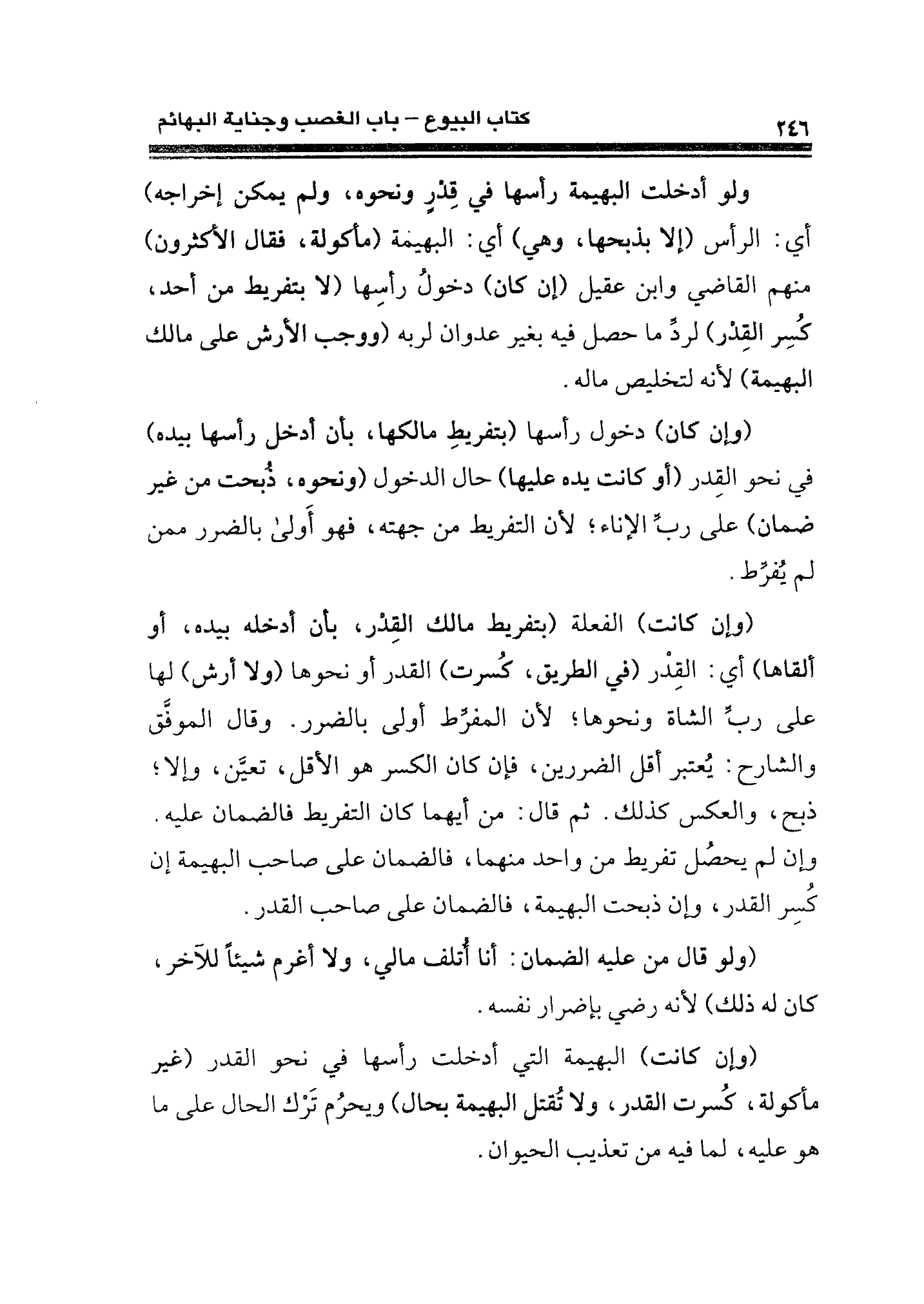 ولو أدخلت البهيمة رأسها في قِدْرٍ ونحوه، ولم يمكن إخراجه) أي: الرأس (إلا بذبحها، وهي) أي: البهيمة (مأكولة، فقال الأكثرون) منهم القاضي وابن عقيل (إن كان) دخولُ رأسِها إلا بتفريط من أحد، كُسِر القِدْر) لردِّ ما حصل فيه بغير عدوان لربه (ووجب الأرش على مالك البهيمة) لأنه لتخليص ماله.