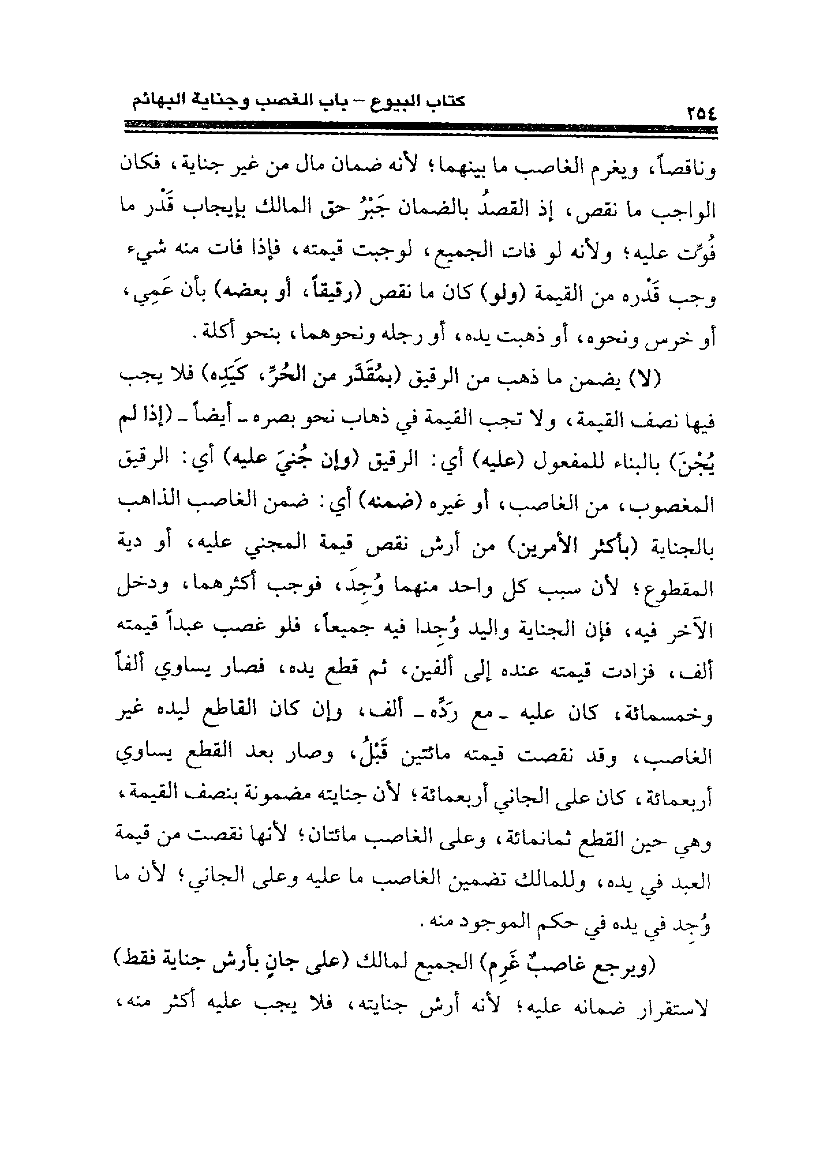 (لا) يضمن ما ذهب من الرقيق (بمُقَدَّر من الحُرِّ، كَيَدِه) فلا يجب فيها نصف القيمة، ولا تجب القيمة في ذهاب نحو بصره -أيضًا- (إذا لم يُجْنَ) بالبناء للمفعول (عليه) أي: الرقيق (وإن جُنيَ عليه) أي: الرقيق المغصوب، من الغاصب، أو غيره (ضمنه) أي: ضمن الغاصب الذاهب بالجناية (بأكثر الأمرين) من أرش نقص قيمة المجني عليه، أو دية المقطوع؛ لأن سبب كل واحد منهما وُجِدَ، فوجب أكثرهما، ودخل الآخر فيه، فإن الجناية واليد وُجِدا فيه جَميعًا، فلوْ غصب عبدًا قيمته ألف، فزادت قيمته عنده إلى ألفين؛ ثم قطع يده، فصار يساوي ألفًا وخمسمائة، كان عليه -مع رَدِّه- ألف، وإن كان القاطع ليده غير الغاصب، وقد نقصت قيمته مائتين قَبْلُ؛ وصار بعد القطع يساوي أربعمائة، كان على الجاني أربعمائة؛ لأن جنايته مضمونة بنصف القيمة، وهي حين القطع ثمانمائة، وعلى الغاصب مائتان؛ لأنها نقصت من قيمة العبد في يده، وللمالك تضمين الغاصب ما عليه وعلى الجاني؛ لأن ما وُجِد في يده في حكم الموجود منه.