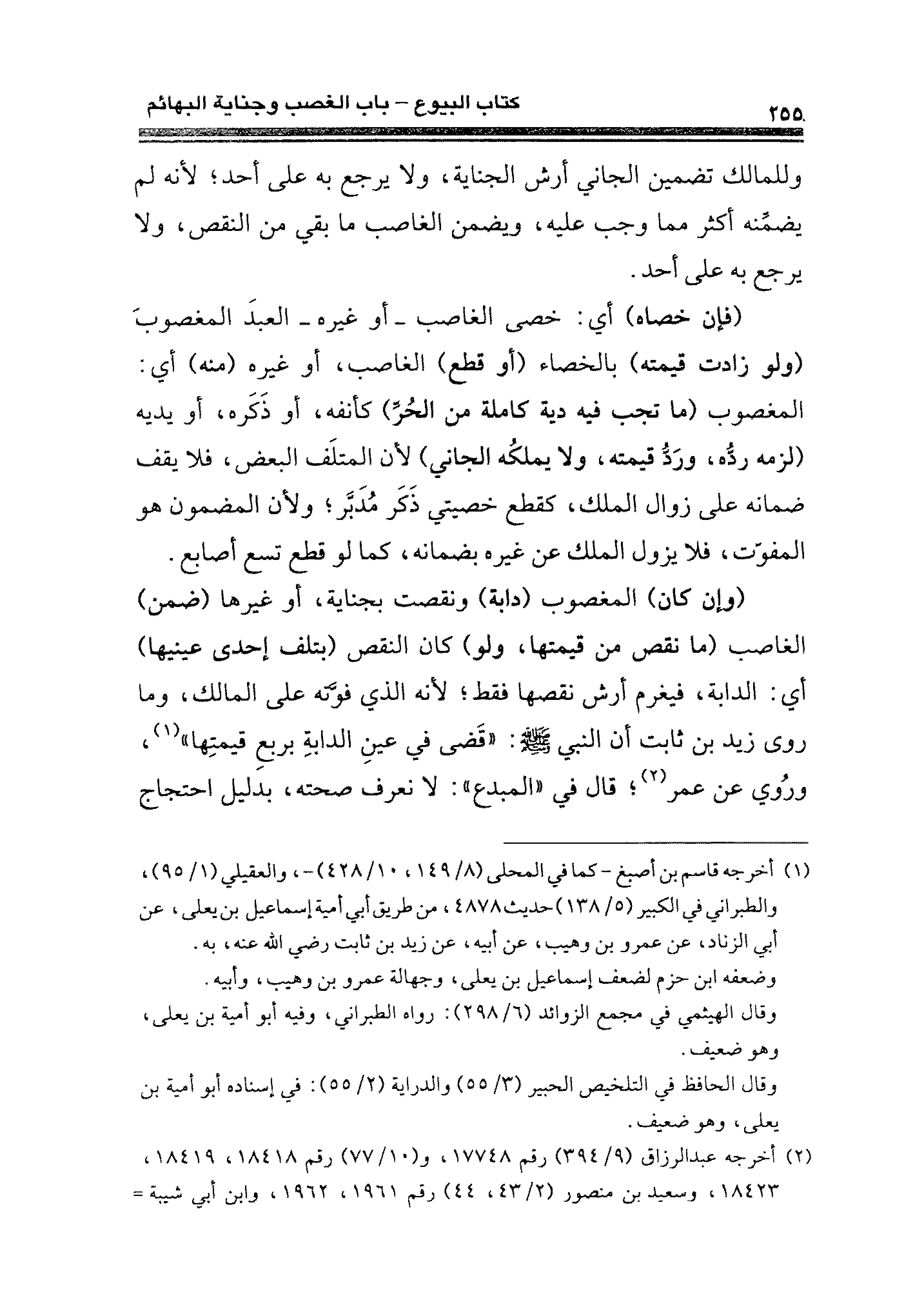 (وإن كان) المغصوب (دابة) ونقصت بجناية، أو غيرها (ضمن) الغاصب (ما نقص من قيمتها، ولو) كان النقص (بتلف إحدى عينيها) أي: الدابة، فيغرم أرش نقصها فقط؛ لأنه الذي فوَّته على المالك، وما روى زيد بن ثابت أن النبي - صلى الله عليه وسلم -: "قَضى في عينِ الدابةِ بربعِ قيمتِها" (¬١)، ورُوي عن عمر (¬٢)؛ قال في "المبدع": لا نعرف صحته، بدليل احتجاج