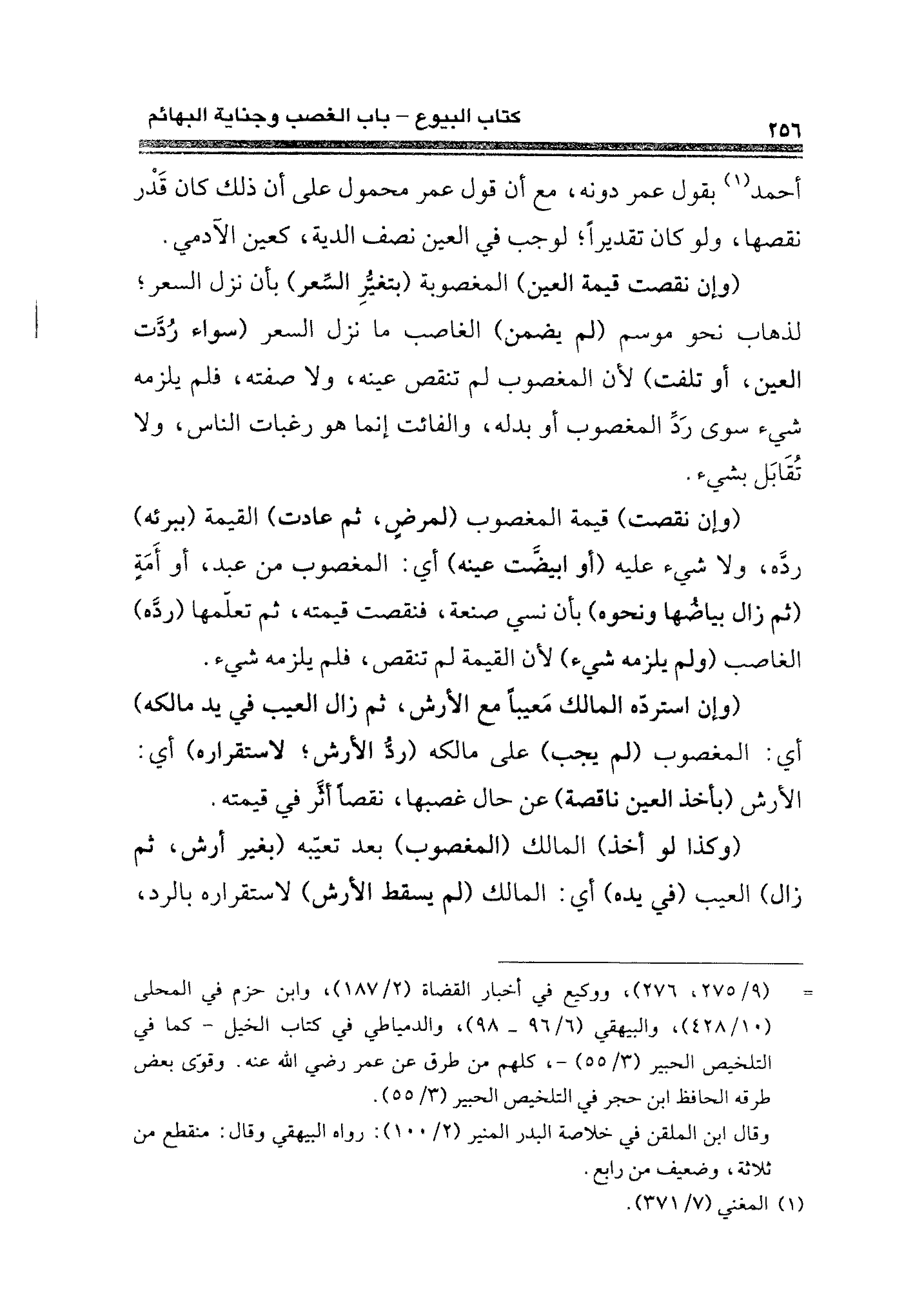 أحمد (¬١) بقول عمر دونه، مع أن قول عمر محمول على أن ذلك كان قَدْر نقصها، ولو كان تقديرًا؛ لوجب في العين نصف الدية، كعين الآدمي.