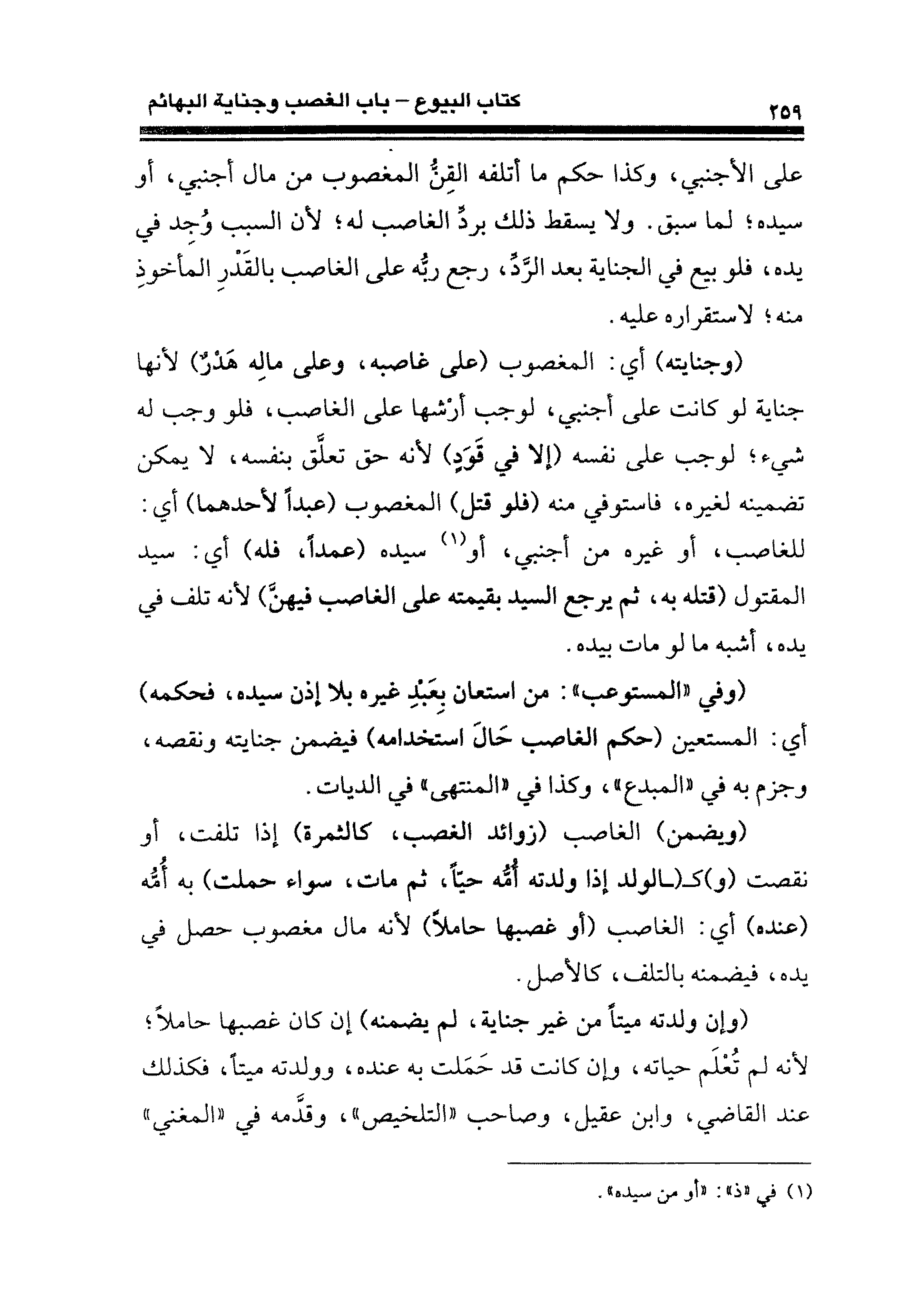 (وفي "المستوعب": من استعان بِعَبْدِ غيره بلا إذن سيده، فحكمه) أي: المستعين (حكم الغاصب حَالَ استخدامه) فيضمن جنايته ونقصه، وجزم به في "المبدع"، وكذا في "المنتهى" في الديات.