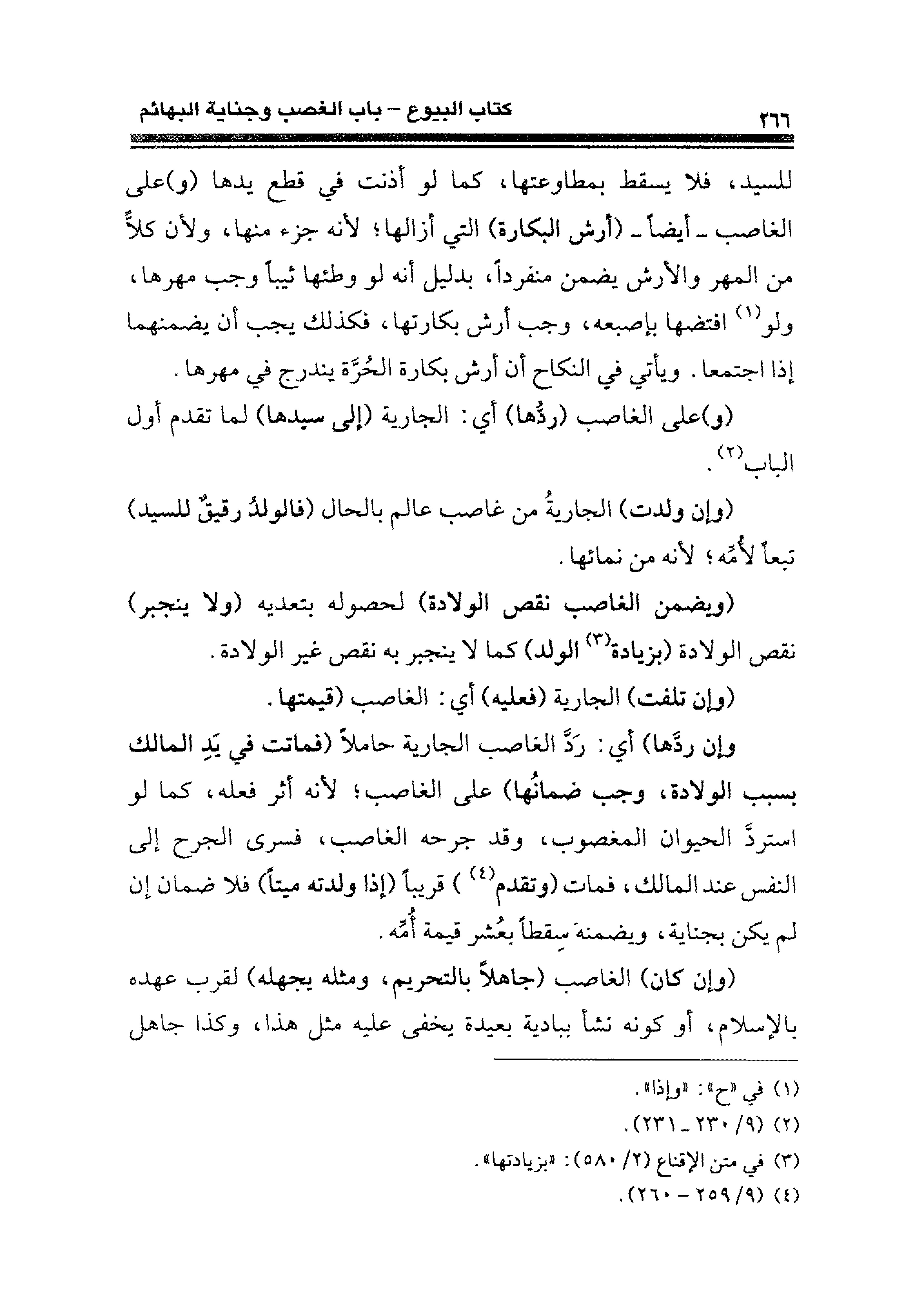 وإن ردَّها) أي: رَدَّ الغاصب الجارية حاملًا (فماتت في يَدِ المالك بسبب الولادة، وجب ضمانُها) على الغاصب؛ لأنه أثر فعله، كما لو استردَّ الحيوان المغصوب، وقد جرحه الغاصب، فسرى الجرح إلى النفس عند المالك، فمات (وتقدم (¬٤)) قريبًا (إذا ولدته ميتًا) فلا ضمان إن لم يكن بجناية، ويضمنه سِقطًا بعُشر قيمة أُمِّه.