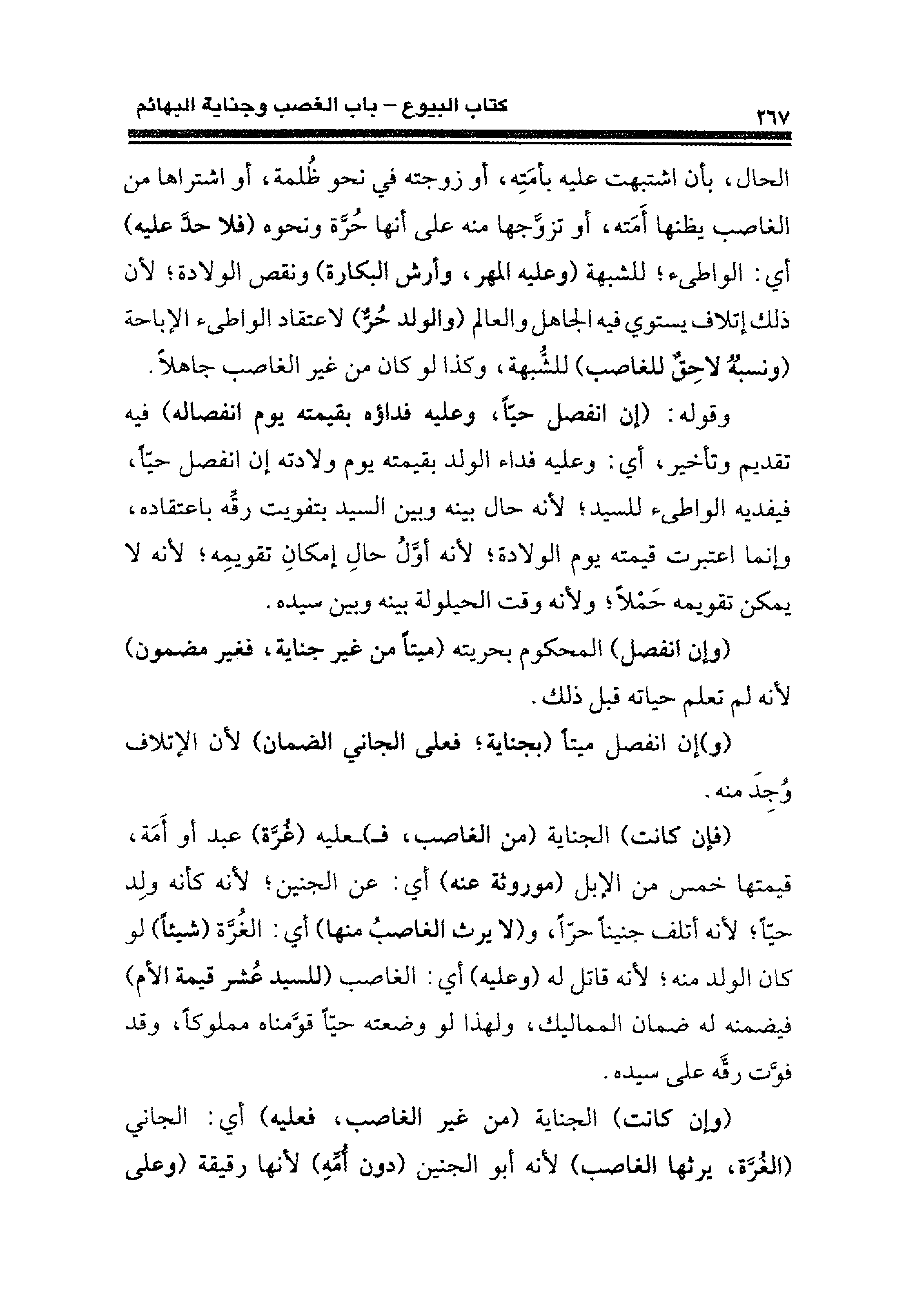 (فإن كانت) الجناية (من الغاصب، فـ) ـعليه (غُرَّة) عبد أو أَمَة، قيمتها خمس من الإبل (موروثة عنه) أي: عن الجنين؛ لأنه كأنه ولِد حيًّا؛ لأنه أتلف جنينًا حرًّا، و (لا يرث الغاصبُ منها) أى: الغُرَّة (شيئًا) لو كان الولد منه؛ لأنه قاتل له (وعليه) أي: الغاصب (للسيد عُشر قيمة الأم) فيضمنه له ضمان المماليك، ولهذا لو وضعته حيًّا قوَّمناه مملوكًا، وقد فوَّت رقَّه على سيده.