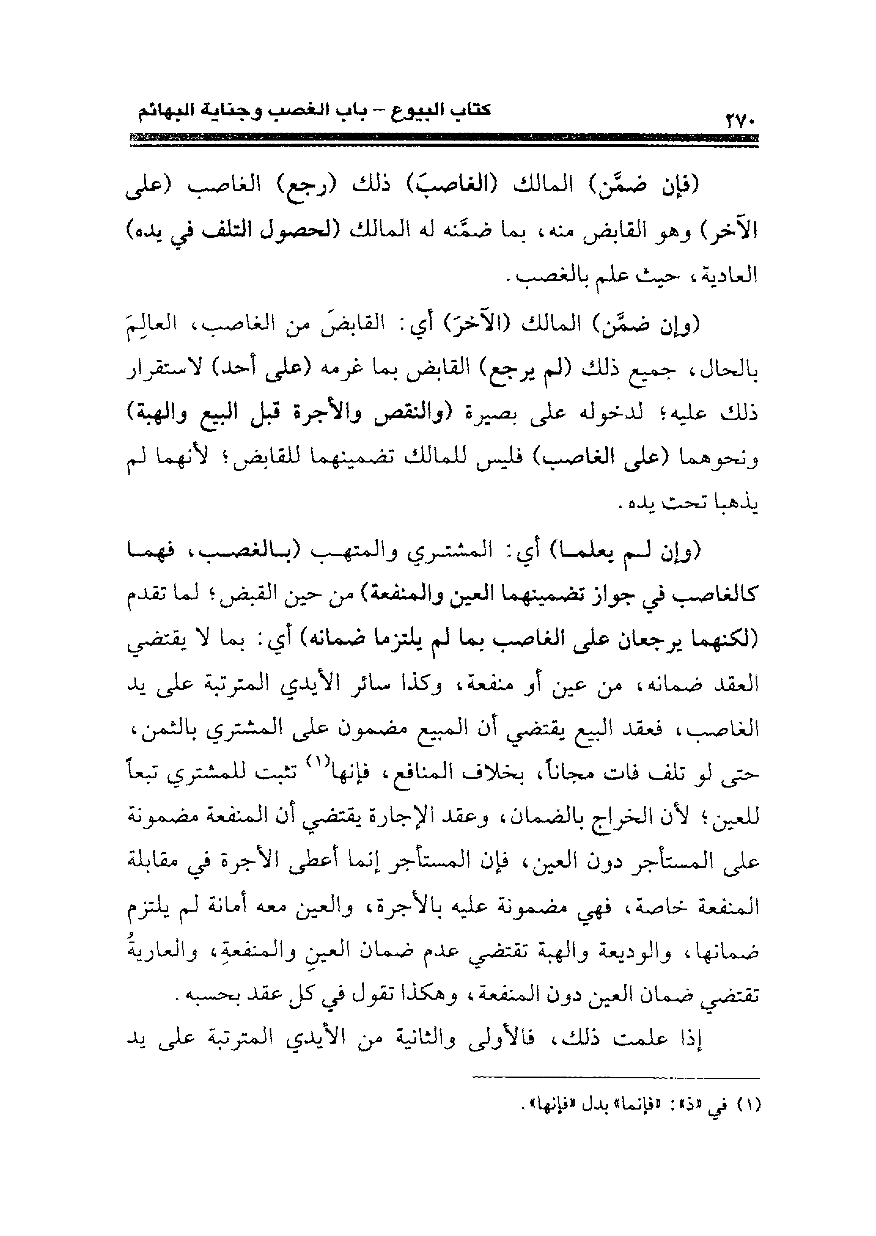 (وإن ضمَّن) المالك (الآخرَ) أي: القابضَ من الغاصب، العالِمَ بالحال، جميع ذلك (لم يرجع) القابض بما غرمه (على أحد) لاستقرار ذلك عليه؛ لدخوله على بصيرة (والنقص والأجرة قبل البيع والهبة) ونحوهما (على الغاصب) فليس للمالك تضمينهما للقابض؛ لأنهما لم يذهبا تحت يده.