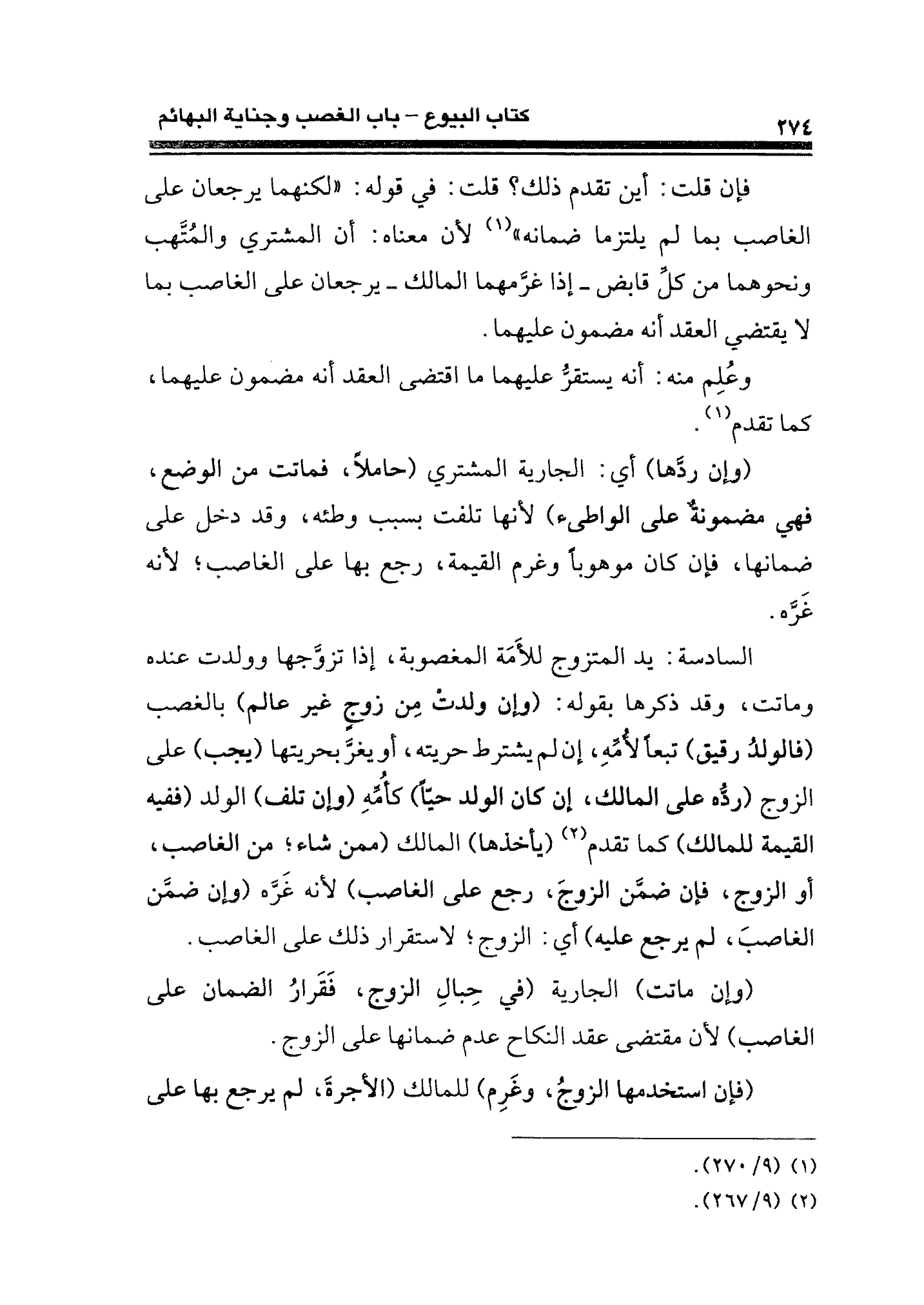 فإن قلت: أين ققدم ذلك؟ قلت: في قوله: "لكنهما يرجعان على الغاصب بما لم يلتزما ضمانه" (¬١) لأن معناه: أن المشتري والمُتَّهب ونحوهما من كلِّ قابض -إذا غرَّمهما المالك- يرجعان على الغاصب بما لا يقتضي العقد أنه مضمون عليهما.