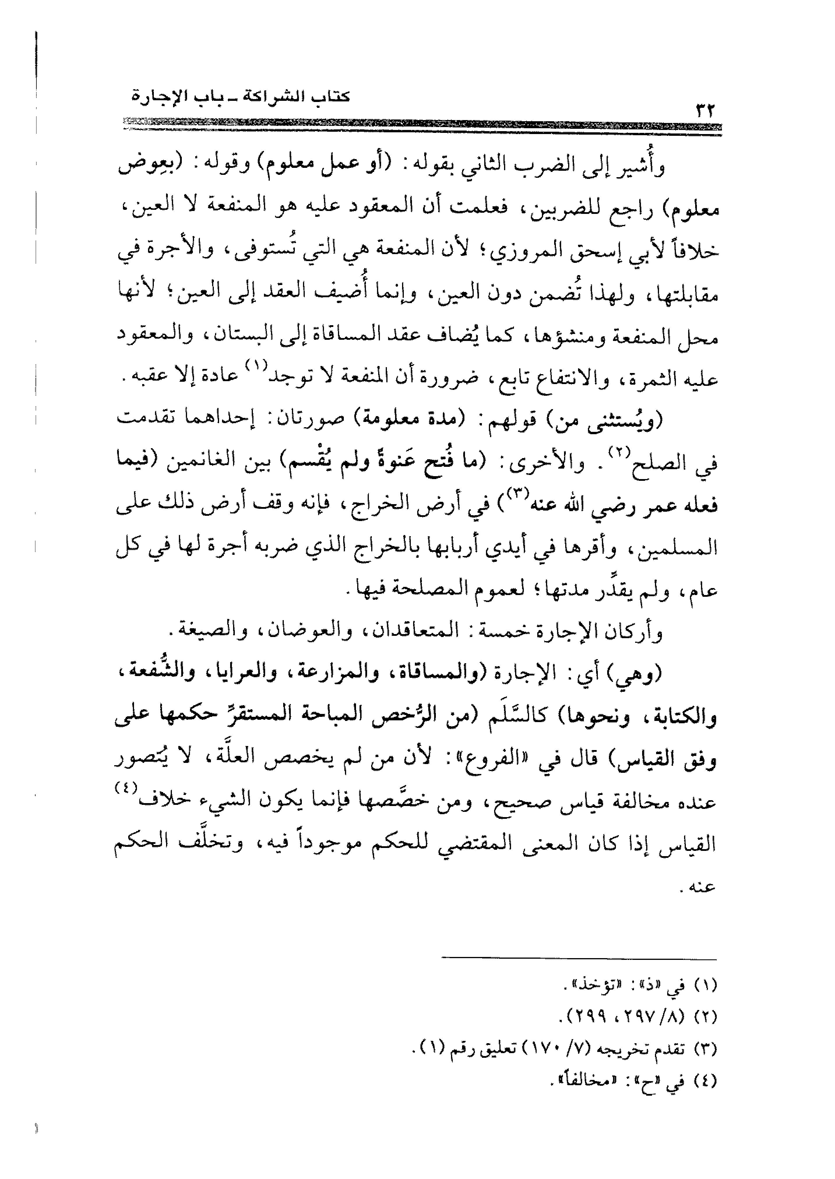 (ويُستثنى من) قولهم: (مدة معلومة) صورتان: إحداهما تقدمت في الصلح (¬٢). والأخرى: (ما فُتح عَنوةً ولم يُقْسم) بين الغانمين (فيما فعله عمر رضي الله عنه (¬٣)) في أرض الخراج، فإنه وقف أرض ذلك على المسلمين، وأقرها في أيدي أربابها بالخراج الذي ضربه أجرة لها في كل عام، ولم يقدِّر مدتها؛ لعموم المصلحة فيها.