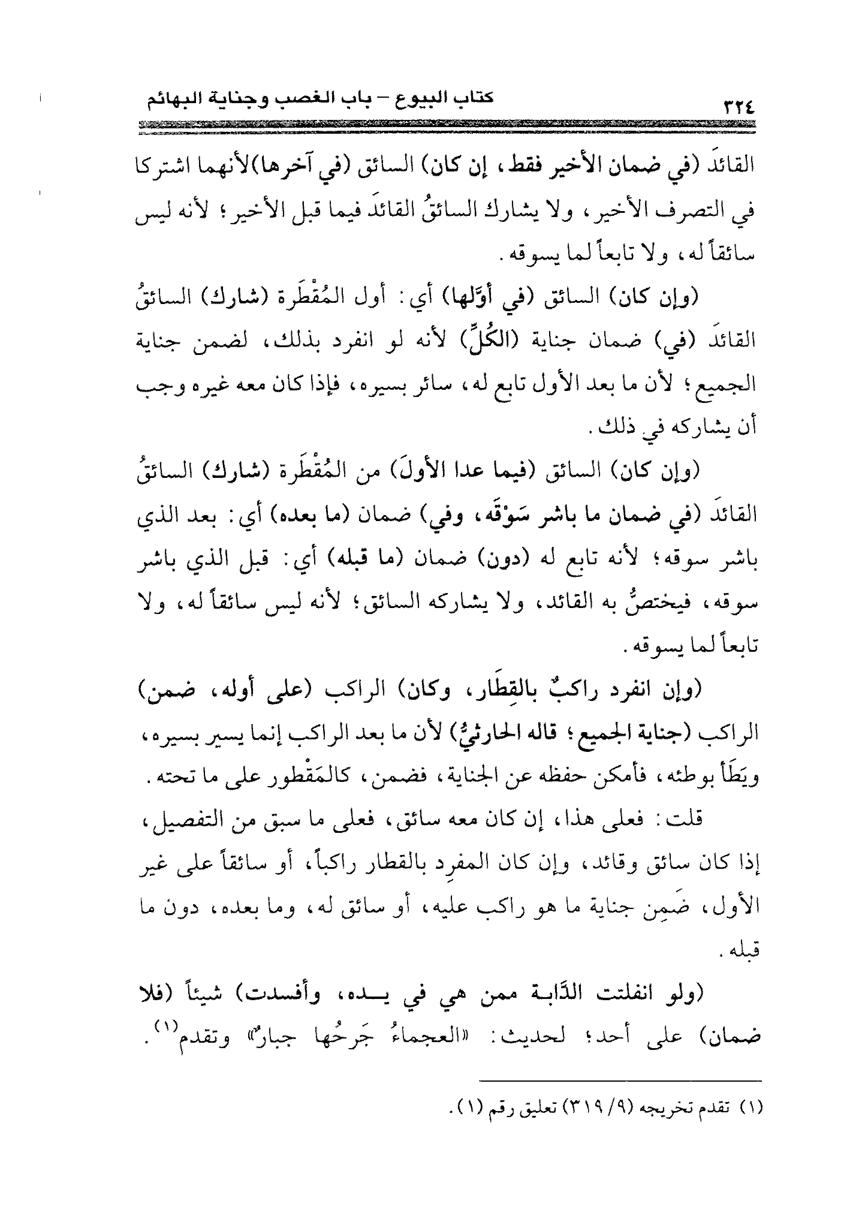 القائدَ (في ضمان الأخير فقط، إن كان) السائق (في آخرها) لأنهما اشتركا في التصرف الأخير، ولا يشارك السائقُ القائدَ فيما قبل الأخير؛ لأنه ليس سائقًا له، ولا تابعًا لما يسوقه.