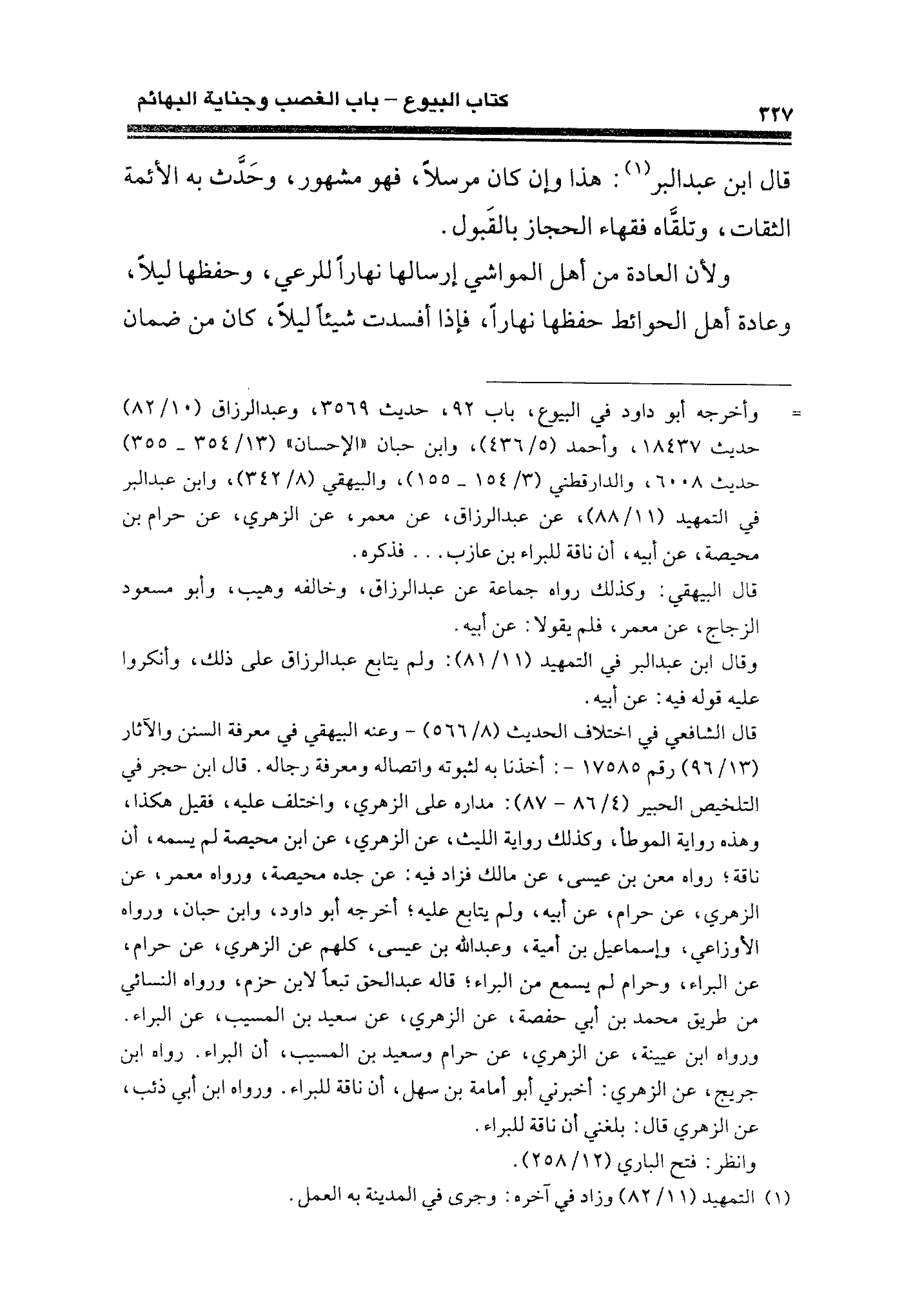 قال الشافعي في اختلاف الحديث (٨/ ٥٦٦) - وعنه البيهقي في معرفة السنن والآثار (١٣/ ٩٦) رقم ١٧٥٨٥ - : أخذنا به لثبوته واتصاله ومعرفة رجاله. قال ابن حجر في التلخيص الحبير (٤/ ٨٦ - ٨٧): مداره على الزهري، واختلف عليه، فقيل هكذا، وهذه رواية الموطأ، وكذلك رواية الليث، عن الزهريّ، عن ابن محيصة لم يسمه، أن ناقة؛ رواه معن بن عيسى، عن مالك فزاد فيه: عن جده محيصة، ورواه معمر، عن الزهري، عن حرام، عن أبيه، ولم يتابع عليه؛ كما أخرجه أبو داود، وابن حبان، ورواه الأوزاعي، وإسماعيل بن أمية، وعبد الله بن عيسى، كلهم عن الزهريّ، عن حرام، عن البراء، وحرام لم يسمع من البراء؛ قاله عبد الحق تبعًا لابن حزم، ورواه النسائي من طريق محمد بن أبي حفصة، عن الزهريّ، عن سعيد بن المسيب، عن البراء. ورواه ابن عيينة، عن الزهريّ، عن حرام وسعيد بن المسيب، أن البراء. رواه ابن جريج، عن الزهري: أخبرني أبو أمامة بن سهل، أن ناقة للبراء. ورواه ابن أبي ذئب، عن الزهريّ قال: بلغني أن ناقة للبراء.