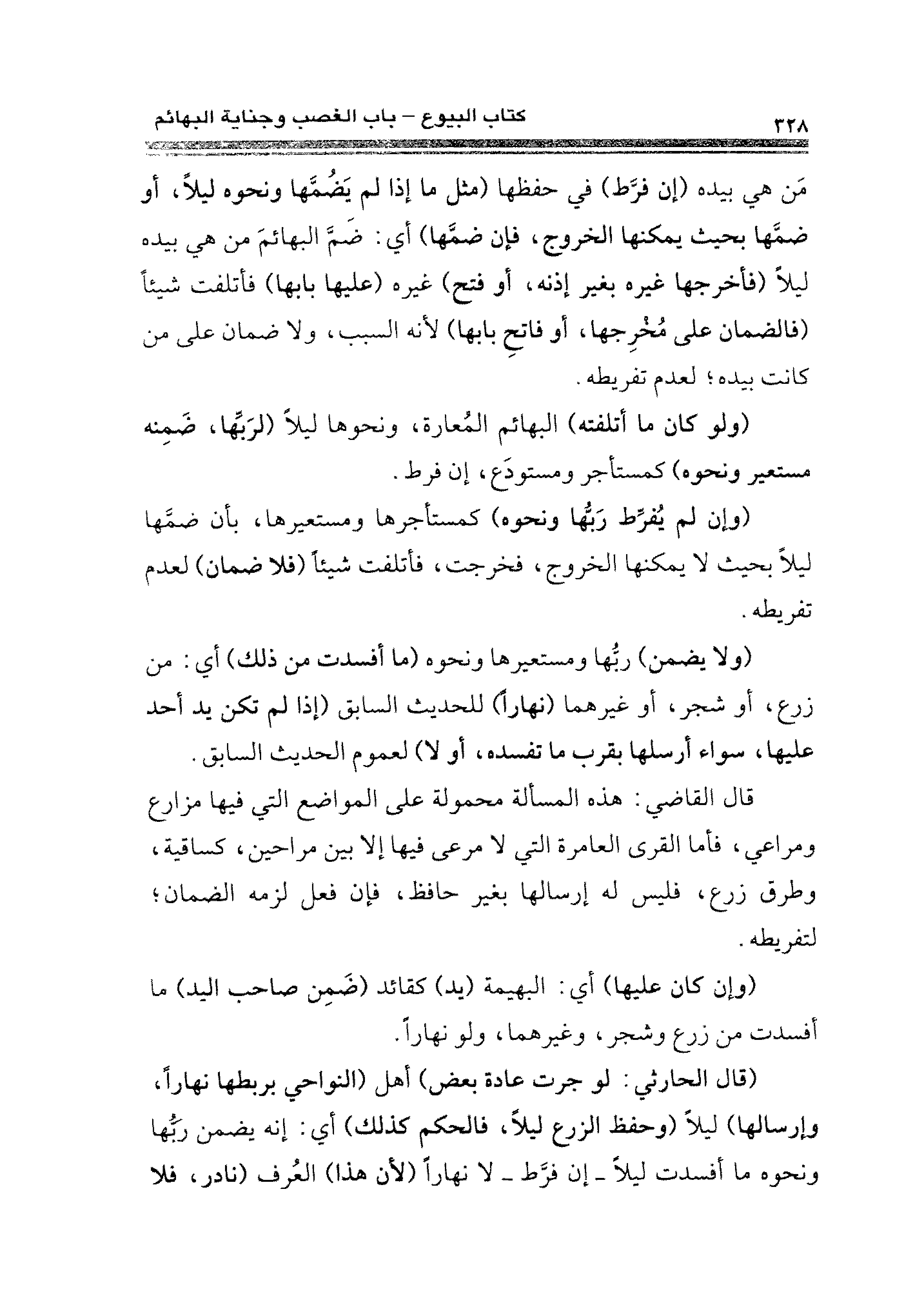 (قال الحارثي: لو جرت مادة بعض) أهل (النواحي بربطها نهارًا، وإرسالها) ليلًا (وحفظ الزرع ليلًا، فالحكم كذلك) أي: إنه يضمن ربها ونحوه ما أفسدت ليلا -إن فرَّط- لا نهارًا (لأن هذا) العُرف (نادر، فلا