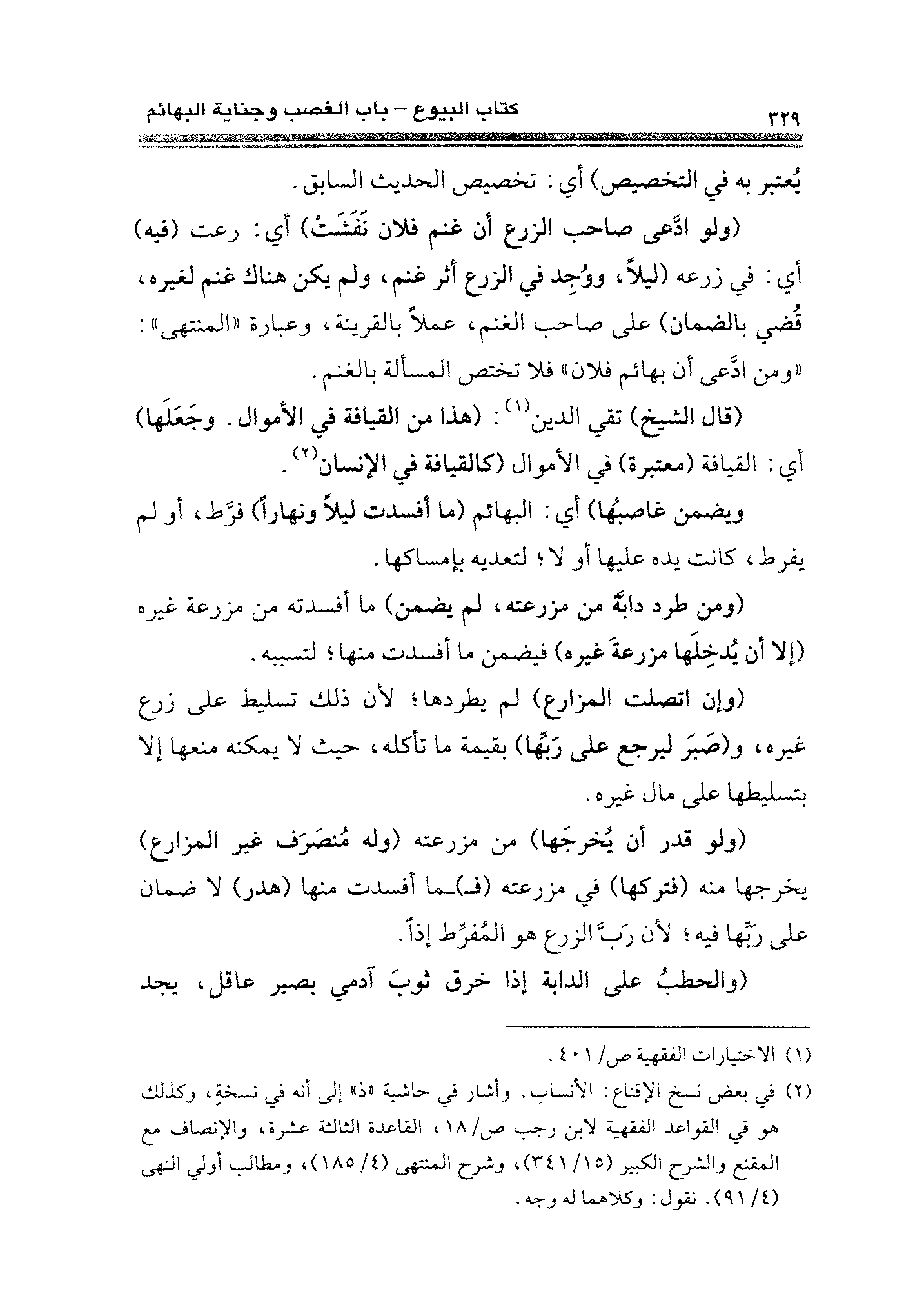 (قال الشيخ) تقي الدين (¬١): (هذا من القيافة في الأموال. وجَعَلَها) أي: القيافة (معتبرة) في الأموال (كالقيافة في الإنسان (¬٢).