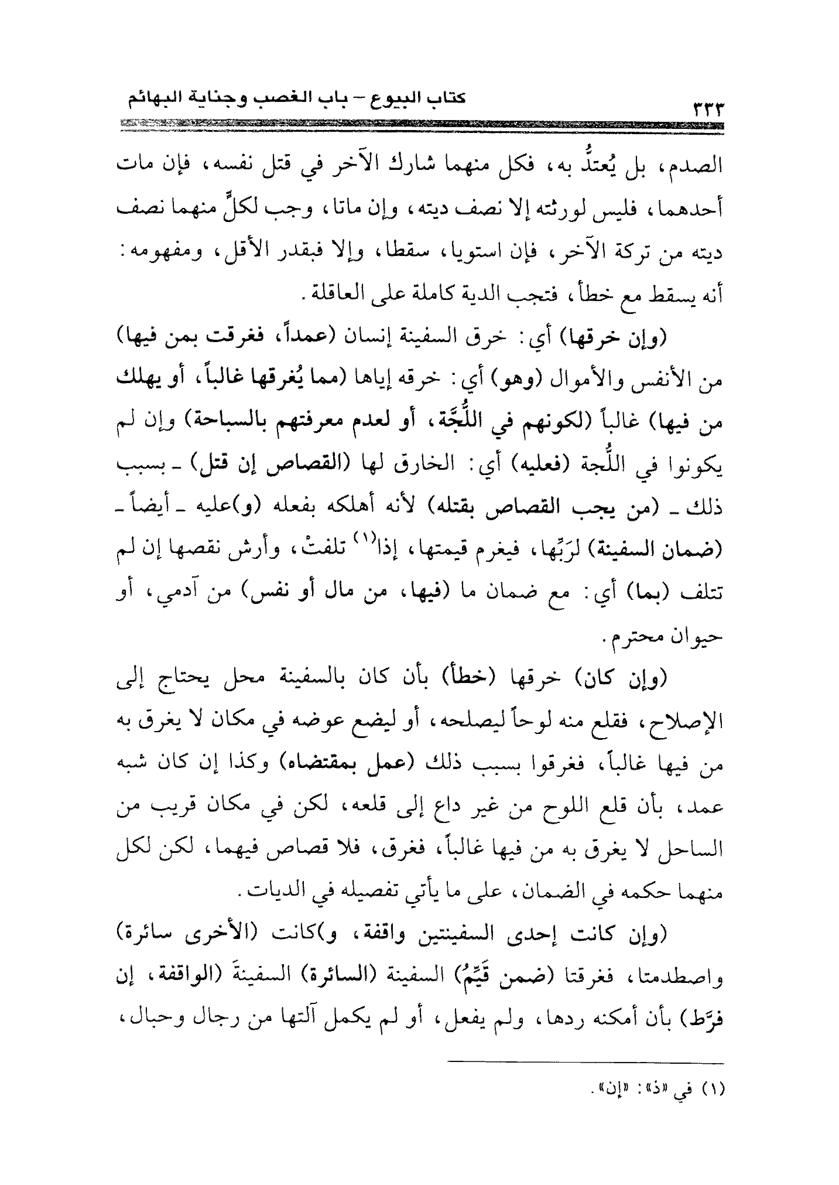 (وإن كان) خرقها (خطأ) بأن كان بالسفينة محل يحتاج إلى الإصلاح، فقلع منه لوحًا ليصلحه، أو ليضع عوف في مكان لا يغرق به من فيها غالبًا، فغرقوا بسبب ذلك (عمل بمقتضاه) وكذا إن كان شبه عمد، بأن قلع اللوح من غير داع إلى قلعه، لكن في مكان قريب من الساحل لا يغرق به من فيها غالبًا، فغرق، فلا قصاص فيهما، لكن لكل منهما حكمه في الضمان، على ما يأتي تفصيله في الديات.