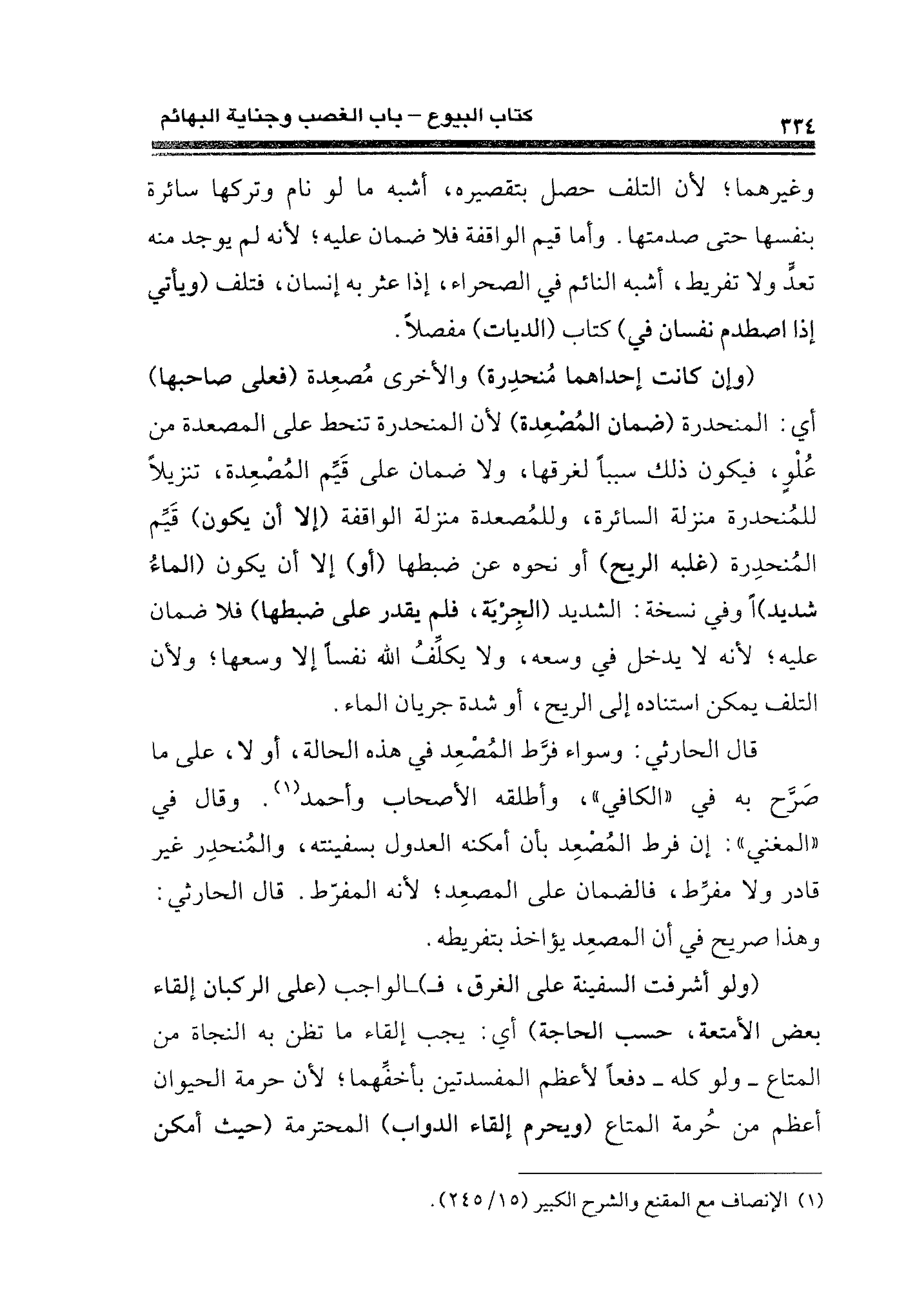 قال الحارثي: وسواء فرَّط المُصْعِد في هذه الحالة، أو لا، على ما صَرح به في "الكافي" وأطلقه الأصحاب وأحمد (¬١). وقال في "المغني": إن فرط المُصعِد بأن أمكنه العدول بسفينته، والمُنحدِر غير قادر ولا مفرِّط، فالضمان على المصعِد؛ لأنه المفرط. قال الحارثي: وهذا صريح في أن المصعِد يؤاخذ بتفريطه.