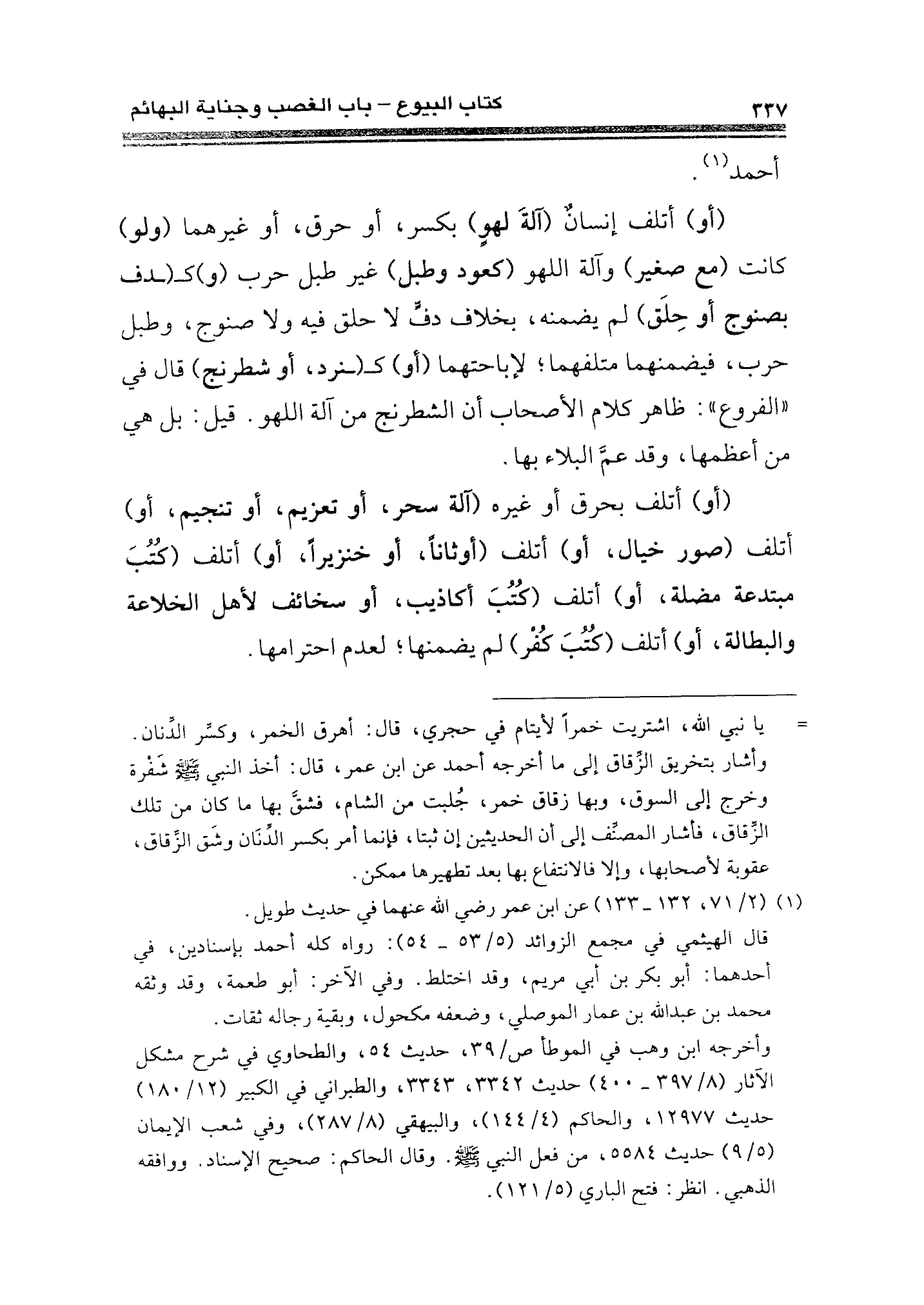 (أو) أتلف إنسانٌ (آلةَ لهوٍ) بكسر، أو حرق، أو غيرهما (ولو) كانت (مع صغير) وآلة اللهو (كعود وطبل) غير طبل حرب (و) كـ (ـدف بصنوج أو حِلَق) لم يضمنه، بخلاف دفٍّ لا حلق فيه ولا صنوج، وطبل حرب، فيضمنهما متلفهما؛ لإباحتهما (أو) كـ (ـنرد، أو شطرنج) قال في "الفروع": ظاهر كلام الأصحاب أن الشطرنج من آلة اللهو. قيل: بل هي من أعظمها، وقد عمَّ البلاء بها.