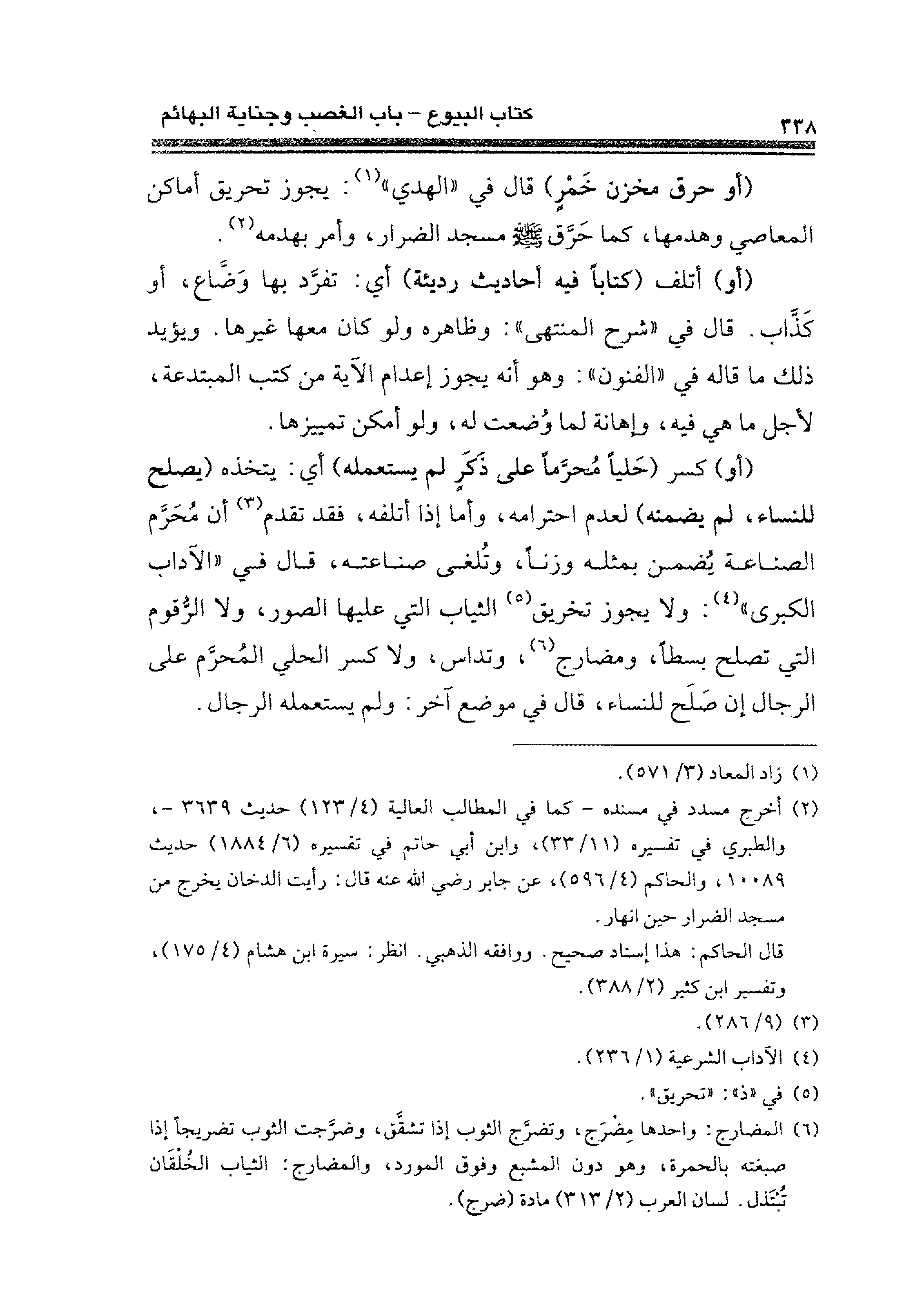 (أو) كسر (حَليًا مُتحرَّمًا على ذَكَرٍ لم يستعمله) أي: يتخذه (يصلح للنساء، لم يضمنه) لعدم احترامه، وأما إذا أتلفه، فقد تقدم (¬٣) أن مُحَرَّم الصناعة يُضمن بمثله وزنا، وتُلغى صناعته، قال في "الآداب الكبرى" (¬٤): ولا يجوز تخريق (¬٥) الثياب التي عليها الصور، ولا الرُّقوم التي تصلح بسطًا، ومضارج (¬٦)، وتداس، ولا كسر الحلي المُحرَّم على الرجال إن صَلَح للنساء، قال في موضع آخر: ولم يستعمله الرجال.