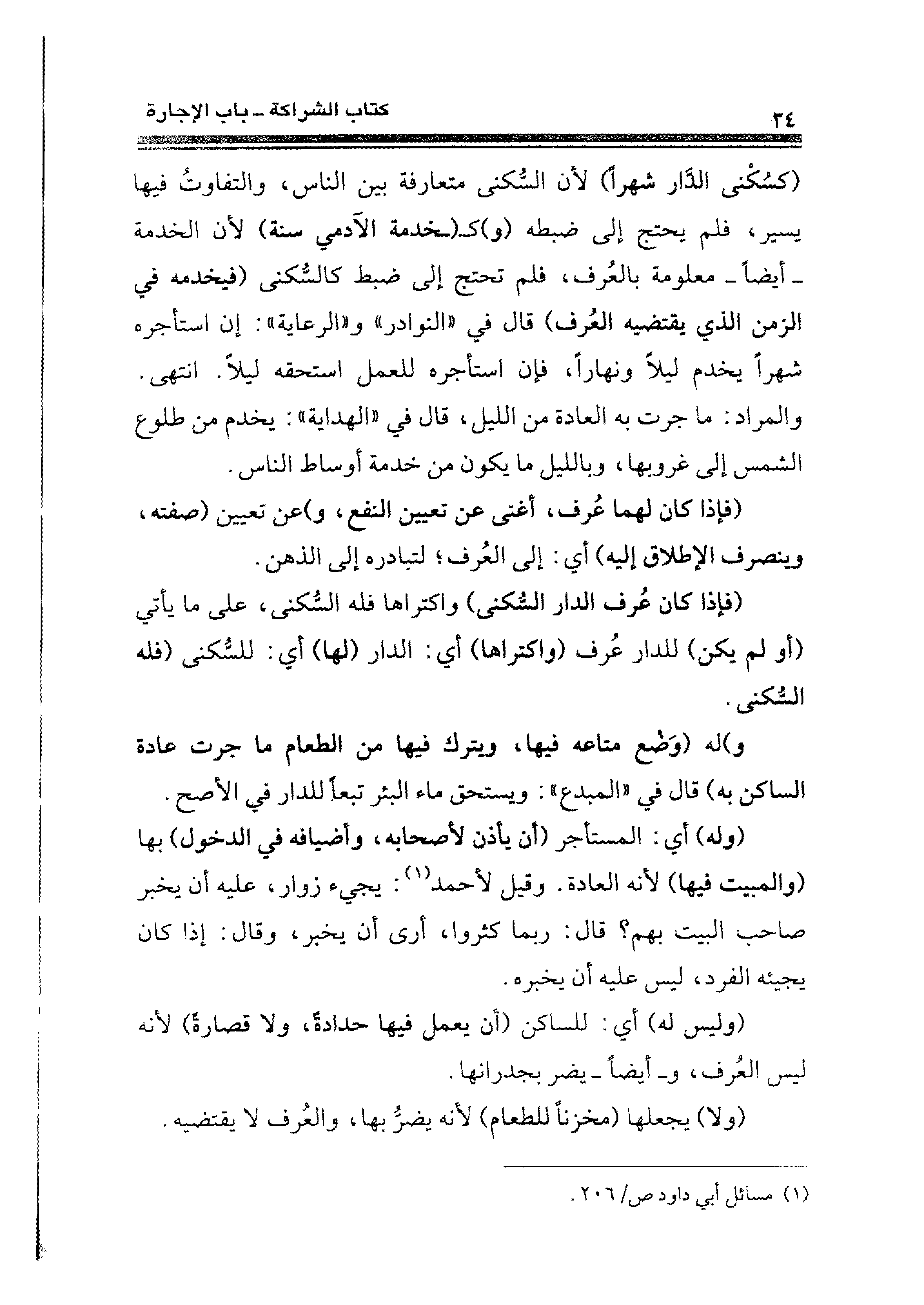 (كسُكْنى الدَّار شهرًا) لأن السُّكنى. متعارفة بين الناس، والتفاوت فيها يسير، فلم يحتج إلى ضبطه (و) كـ (ـخدمة الآدمي. سنة) لأن الخدمة -أيضًا- معلومة بالعُرف، فلم تحتج إلى ضبط كالسُّكنى (فيخدمه في الزمن الذي يقتضيه العُرف) قال في "النوادر" و "الرعاية": إن استأجره شهرًا يخدم ليلًا ونهارًا، فإن استأجره للعمل استحقه ليلًا. انتهى. والمراد: ما جرت به العادة من الليل، قال في "الهداية": يخدم من طلوع الشمس إلى غروبها، وبالليل ما يكون من خدمة أوساط الناس.