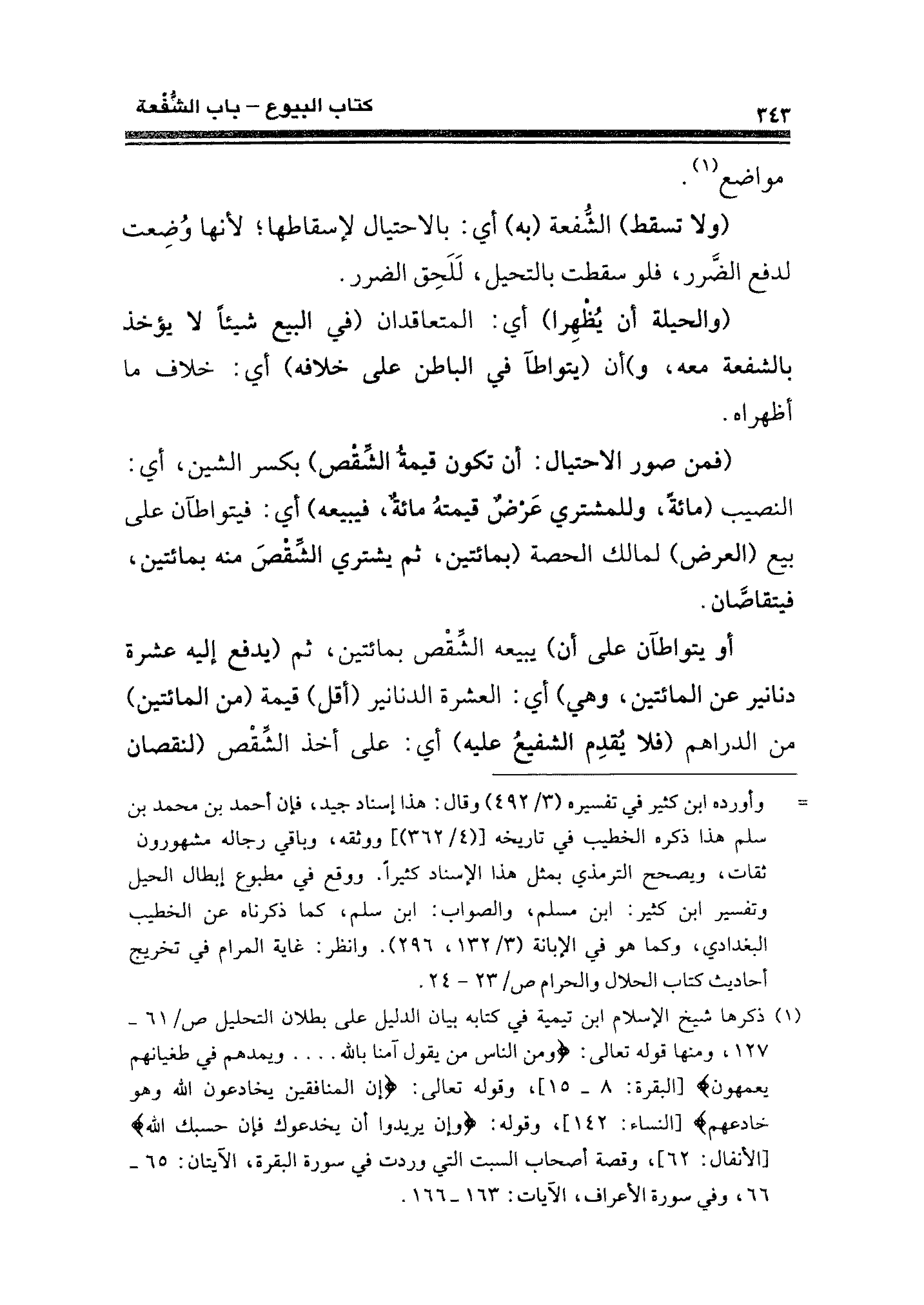 (فمن صور الاحتيال: أن تكون قيمةُ الشِّقْص) بكر الشين، أي: النصيب (مائةً، وللمشترى عَرْضٌ قيمتهُ مائةٌ، فيبيعه) أي: فيتواطآن على بيع (العرض) لمالك الحصة (بمائتين، ثم يشتري الشَّقْصَ منه بمائتين، فيتقاصَّان.