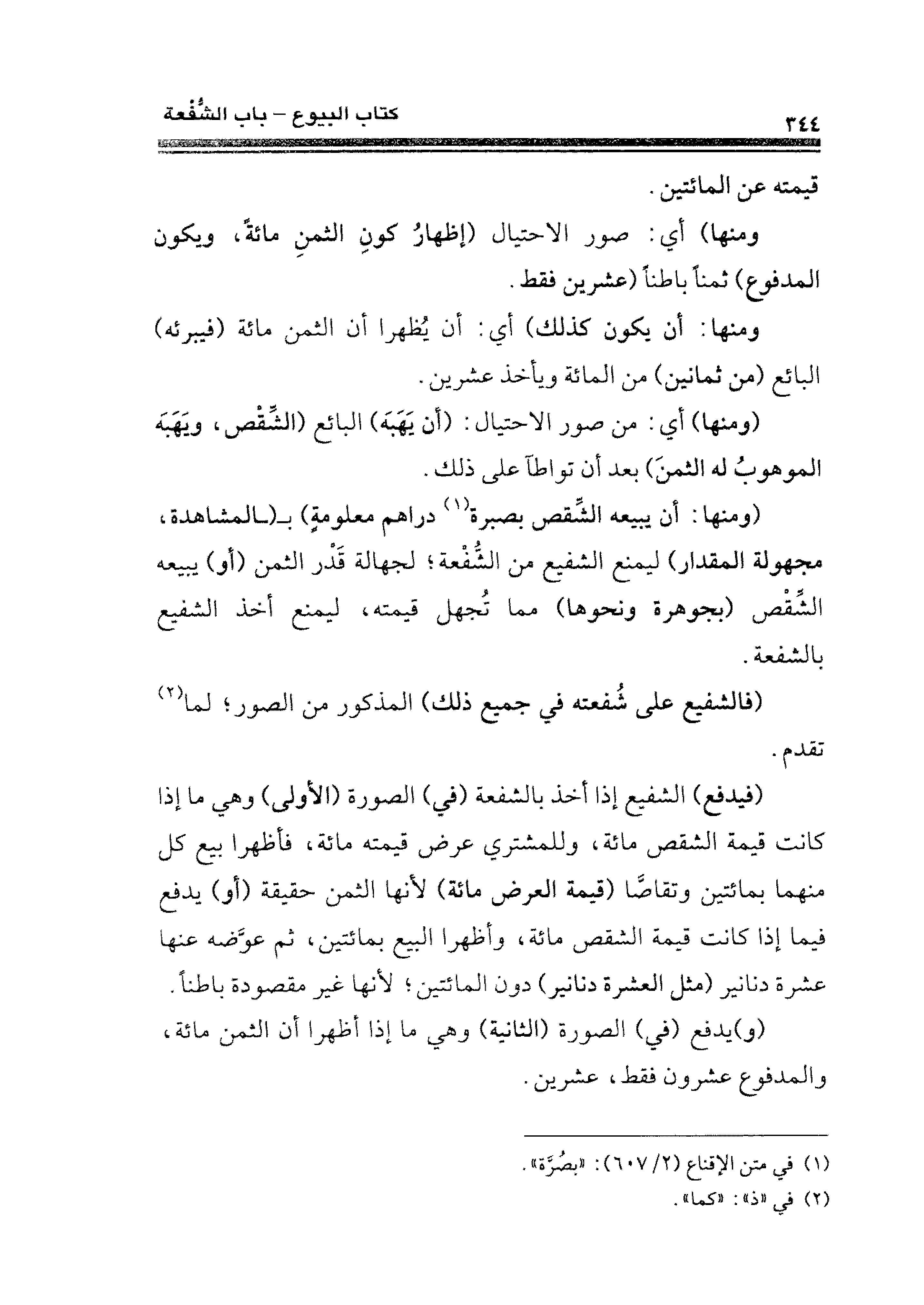 (فيدفع) الشفيع إذا أخذ بالشفعة (في) الصورة (الأولى) وهي ما إذا كانت قيمة الشَّقص مائة، وللمشتري عرض قيمته مائة، فأظهرا بيع كل منهما بمائتين وتقاصَّا (قيمة العرض مائة) لأنها الثمن حقيقة (أو) يدفع فيما إذا كانت قيمة الشَّقص مائة، وأظهرا البيع بمائتين، ثم عوَّضه عنها عشرة دنانير (مثل العشرة دنانير) دون المائتين؛ لأنها غير مقصودة باطنًا.