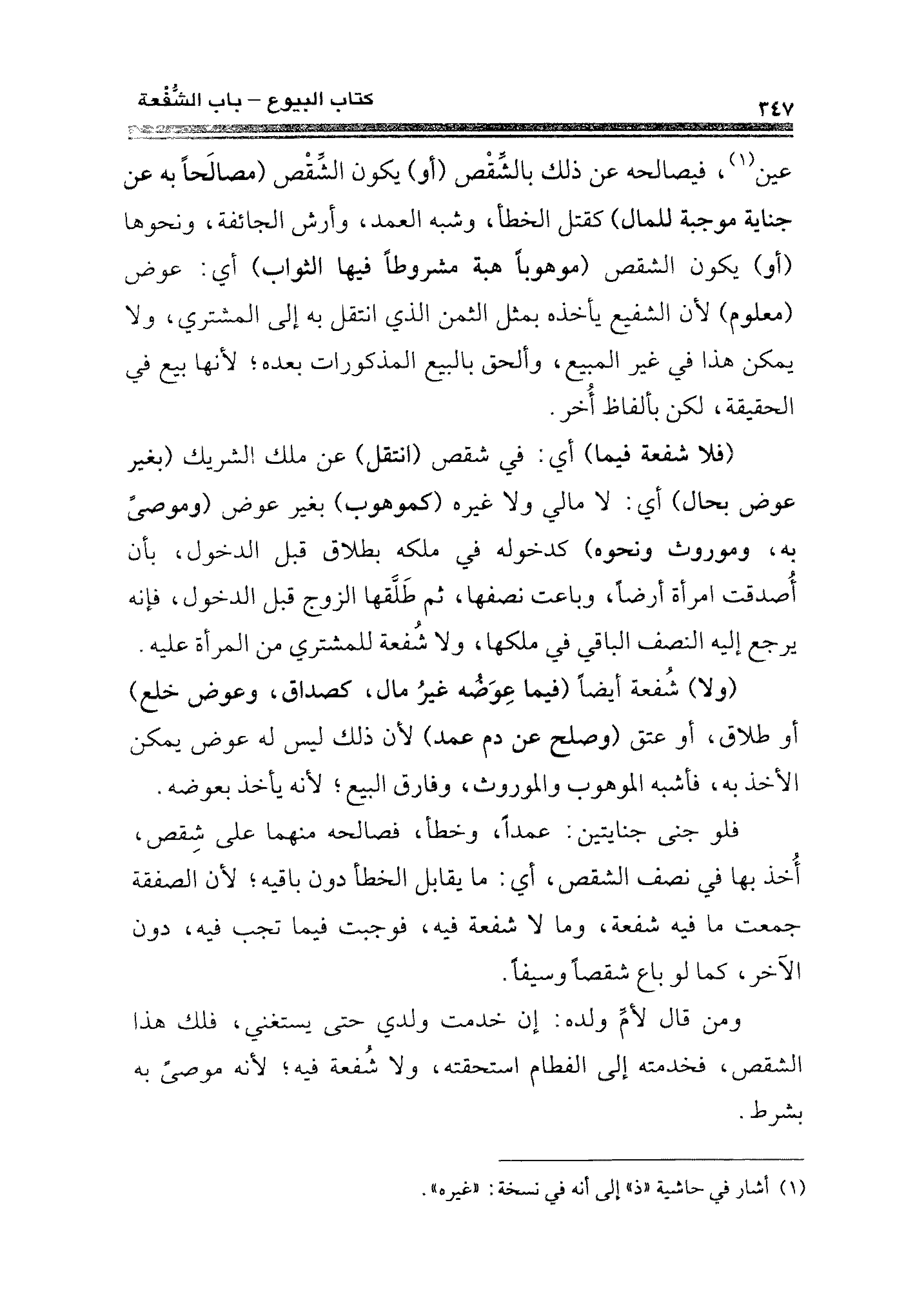 عين (¬١)، فيصالحه عن ذلك بالشِّقْص (أو) يكون الشِّقْص (مصالَحًا به عن جناية موجبة للمال) كقتل الخطأ، وشبه العمد، وأرش الجائفة، ونحوها (أو) يكون الشقص (موهوبًا هبة مشروطًا فيها الثواب) أي: عوض (معلوم) لأن الشفيع يأخذه بمثل الثمن الذي انتقل به إلى المشتري، ولا يمكن هذا في غير المبيع، وألحق بالبيع المذكورات بعده؛ لأنها بيع في الحقيقة، لكن بألفاظ أُخر.