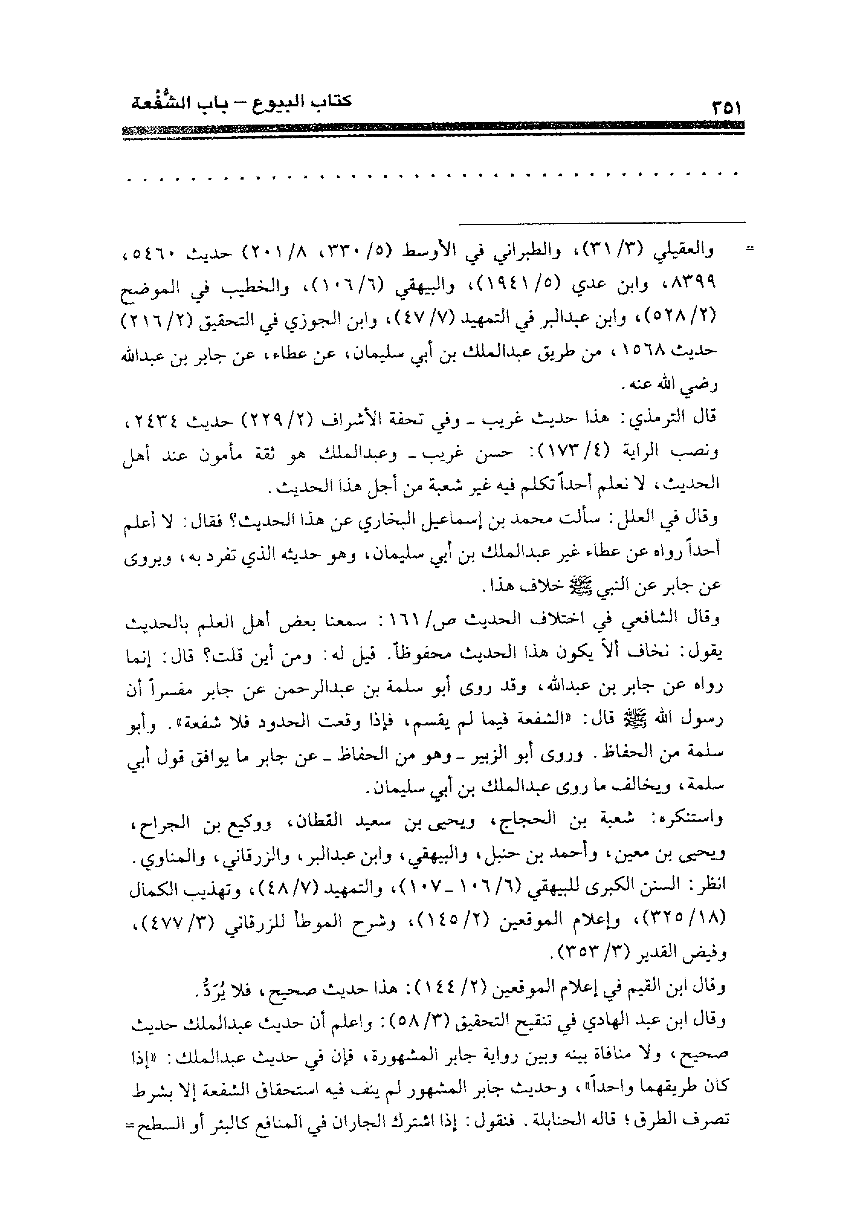 وقال الشافعي في اختلاف الحديث ص/ ١٦١: سمعنا بعض أهل العلم بالحديث يقول: نخاف ألاّ يكون هذا الحديث محفوظًا. قيل له: ومن أين قلت؟ قال: إنما رواه عن جابر بن عبد الله، وقد روى أبو سلمة بن عبد الرحمن عن جابر مفسرًا أن رسول الله - صلى الله عليه وسلم - قال: "الشفعة فيما لم يقسم، فإذا وقت الحدود فلا شفعة". وأبو سلمة من الحفاظ. وروى أبو الزبير -وهو من الحفاظ- عن جابر ما يوافق قول أبي سلمة، ويخالف ما روى عبد الملك بن أبي سليمان.
