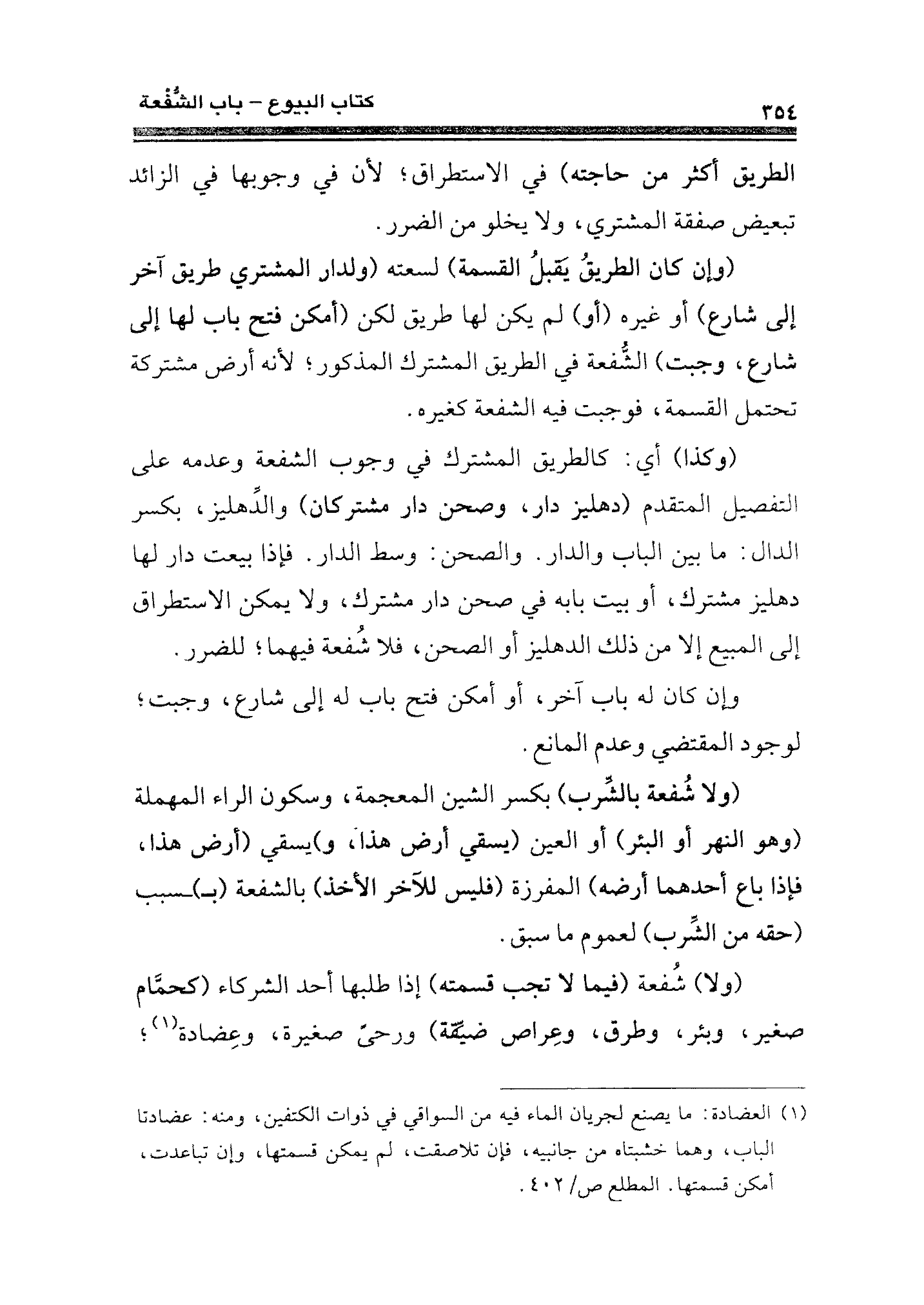 (¬١) العضادة: ما يصنع لجريان الماء فيه من السواقي في ذوات الكتفين، ومنه: عضادتا الباب، وهما خشبتاه من جانبيه، فإن تلاصقت، لم يمكن قسمتها، وإن تباعدت، أمكن قسمتها. المطلع ص/ ٤٠٢.