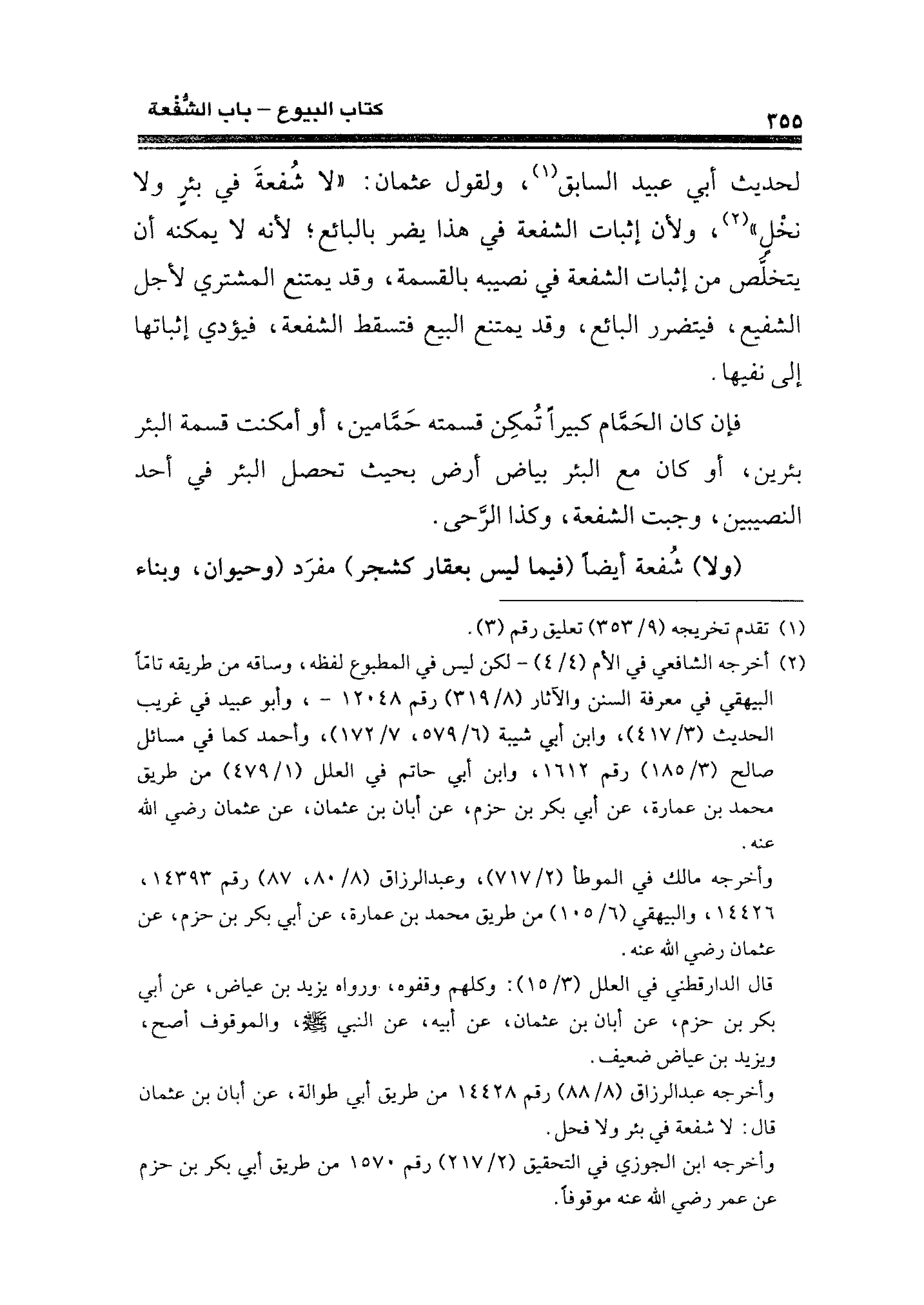لحديث أبي عبيد السابق (¬١)، ولقول عثمان: "لا شُفعةَ في بئرٍ ولا نخْلٍ" (¬٢)، ولأن إثبات الشفعة في هذا يضر بالبائع؛ لأنه لا يمكنه أن يتخلَّص من إثبات الشفعة في نصيبه بالقسمة، وقد يمتنع المشتري لأجل الشفيع، فيتضرر البائع، وقد يمتنع البيع فتسقط الشفعة، فيؤدي إثباتها إلى نفيها.