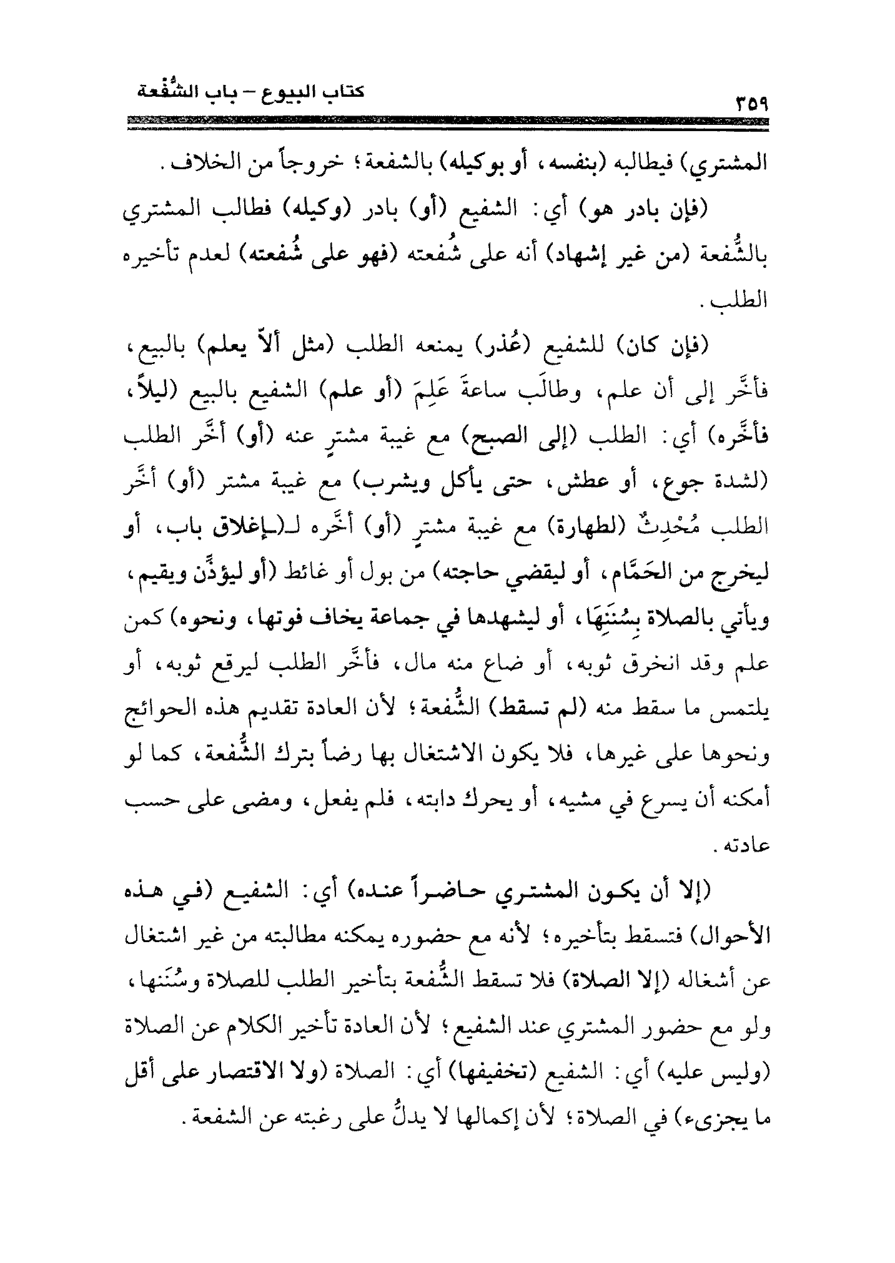 (إلا أن يكون المشتري حاضرًا عنده) أي: الشفيع (في هذه الأحوال) فتسقط بتأخره؛ لأنه مع حضوره يمكنه مطالبته من غير اشتغال عن أشغاله (إلا الصلاة) فلا تسقط الشُّفعة بتأخير الطلب للصلاة وسُنَنها، ولو مع حضور اوي عند الشفيع؛ لأن العادة تأخير الكلام عن الصلاة (وليس عليه) أي: الشفيع (تخفيفها) أي: الصلاة (ولا الاقتصار على أقل ما يجزئ) في الصلاة؛ لأن إكمالها لا يدلُّ على رغبته عن الشفعة.