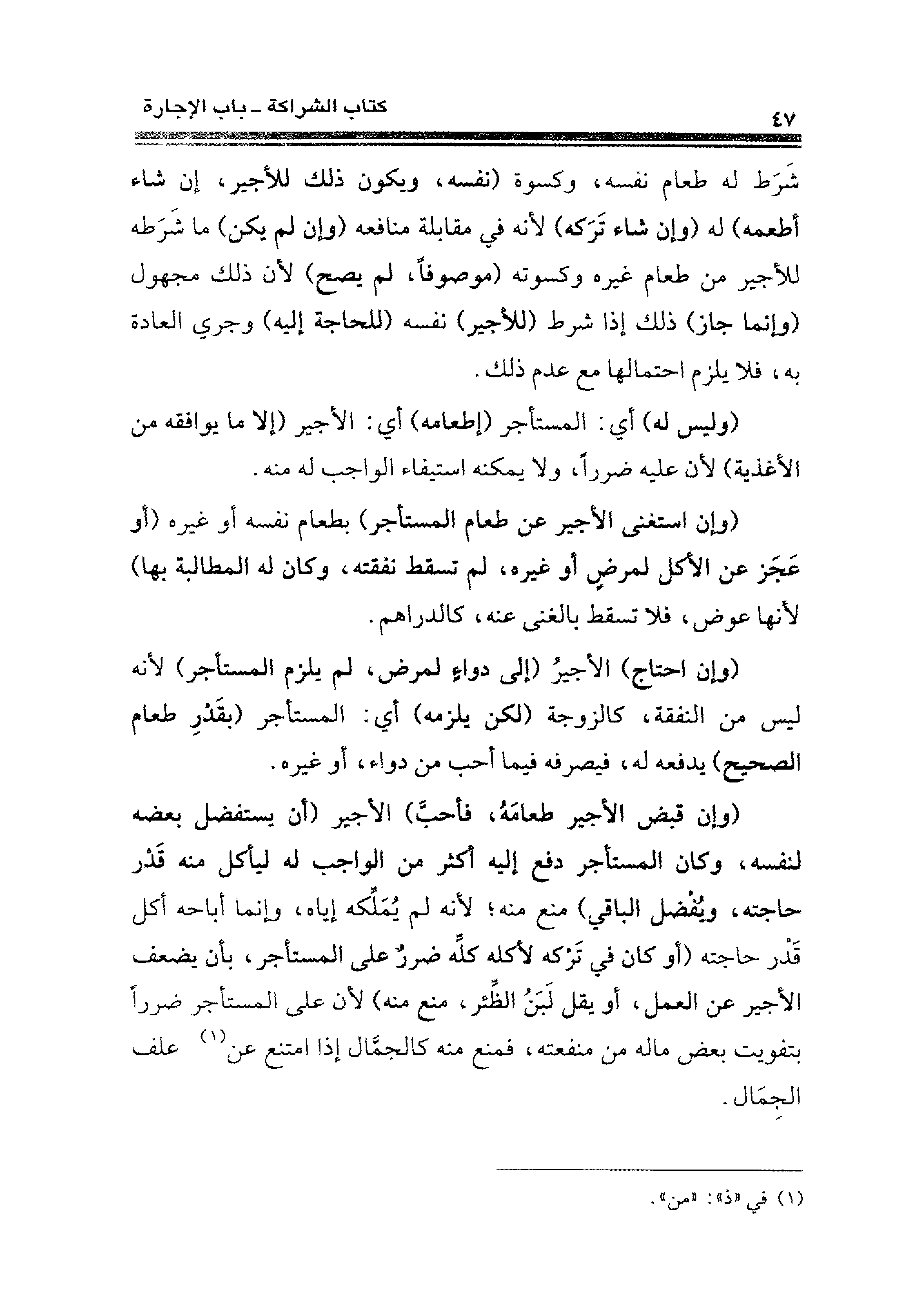 شَرَط له طعام نفسه، وكسوة (نفسه، ويكون ذلك للأجير، إن شاء أطعمه) له (وإن شاء تَرَكه) لأنه في مقابلة منافعه (وإن لم يكن) ما شَرَطه للأجير من طعام غيره وكسوته (موصوفًا، لم يصح) لأن ذلك مجهول (وإنما جاز) ذلك إذا شرط (للأجير) نفسه (للحاجة إليه) وجري العادة به، فلا يلزم احتمالها مع عدم ذلك.