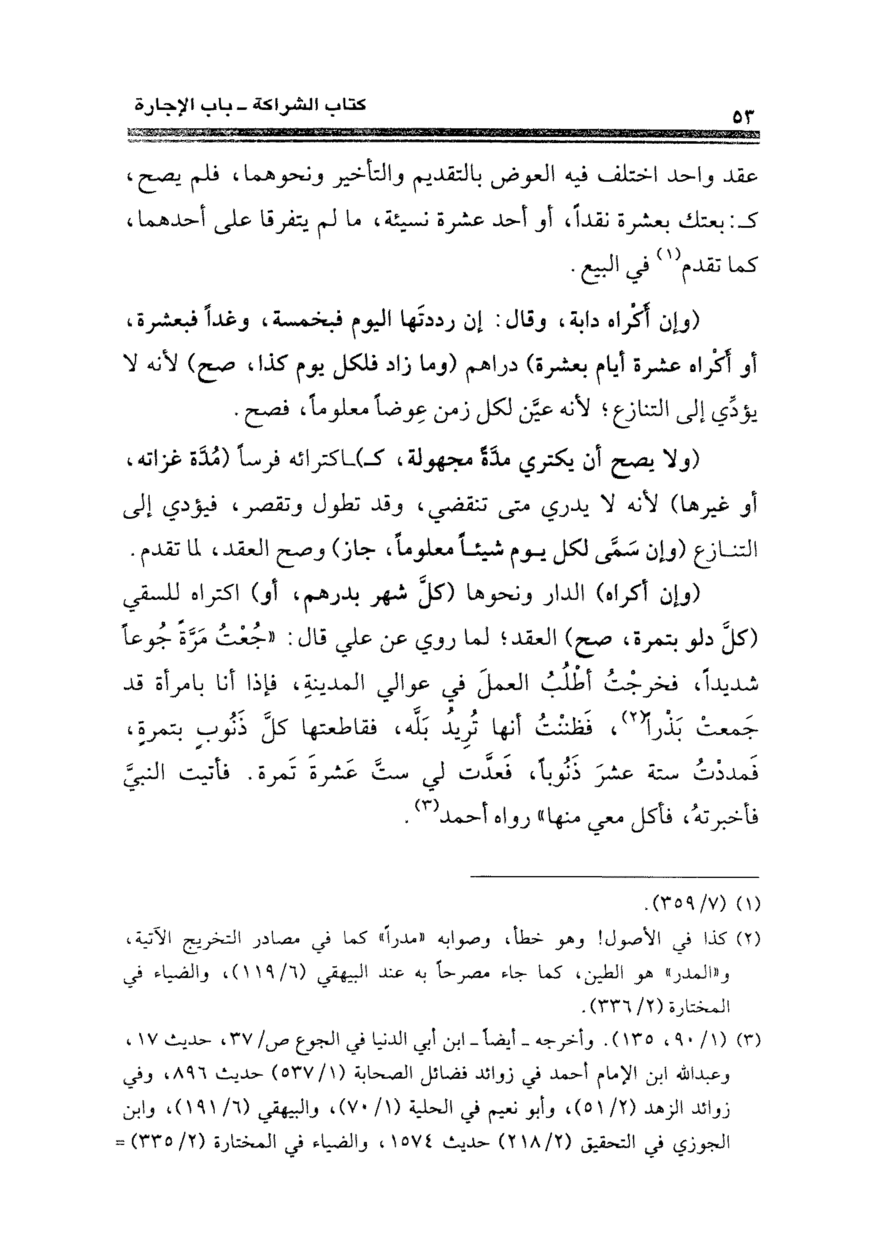 (وإن أكراه) الدار ونحوها (كلَّ شهر بدرهم، أو) اكتراه للسقي (كلَّ دلو بتمرة، صح) العقد؛ لما روي عن علي قال: "جُعْتُ مَرَّةً جُوعًا شديدًا، فخرجْتُ أطْلُبُ العملَ في عوالي المدينةِ، فإذا أنا بامرأة قد جَمعتْ بَذْرًا (¬٢)، فَظْننْتُ أنها تُرِيدُ بَلَّه، فقاطعتها كلَّ ذَنُوبٍ بتمرةٍ، فَمددْتُ ستة عشرَ ذَنُوبًا، فَعدَّت لي ستَّ عَشرةَ تَمرة. فأتيت النبيَّ فأخبرتهُ، فأكل معي منها" رواه أحمد (¬٣).