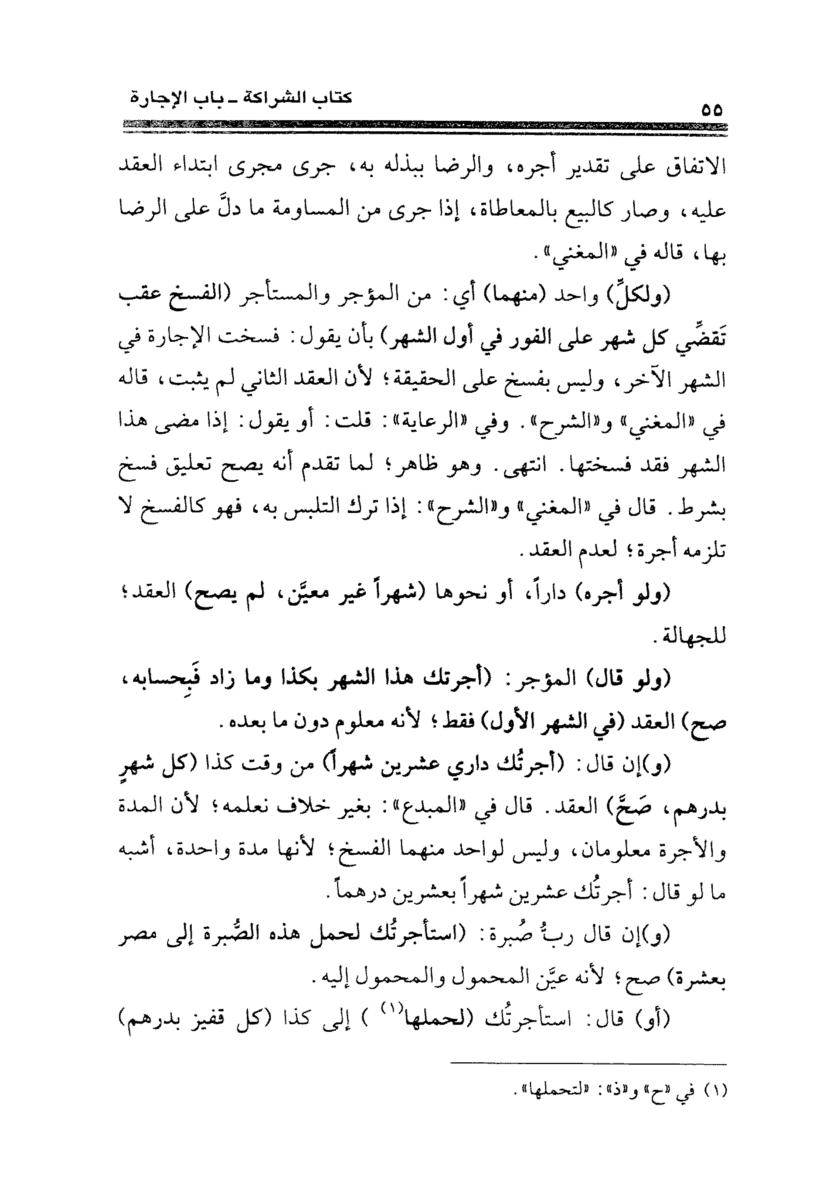 (و) إن قال: (أجرتُك داري عشرين شهرًا) من وقت كذا (كل شهرٍ بدرهم، صَحَّ) العقد. قال في "المبدع": بغير خلاف نعلمه؛ لأن المدة والأجرة معلومان، وليس لواحد منهما الفسخ؛ لأنها مدة واحدة، أشبه ما لو قال: أجرتُك عشرين شهرًا بعشرين درهمًا.