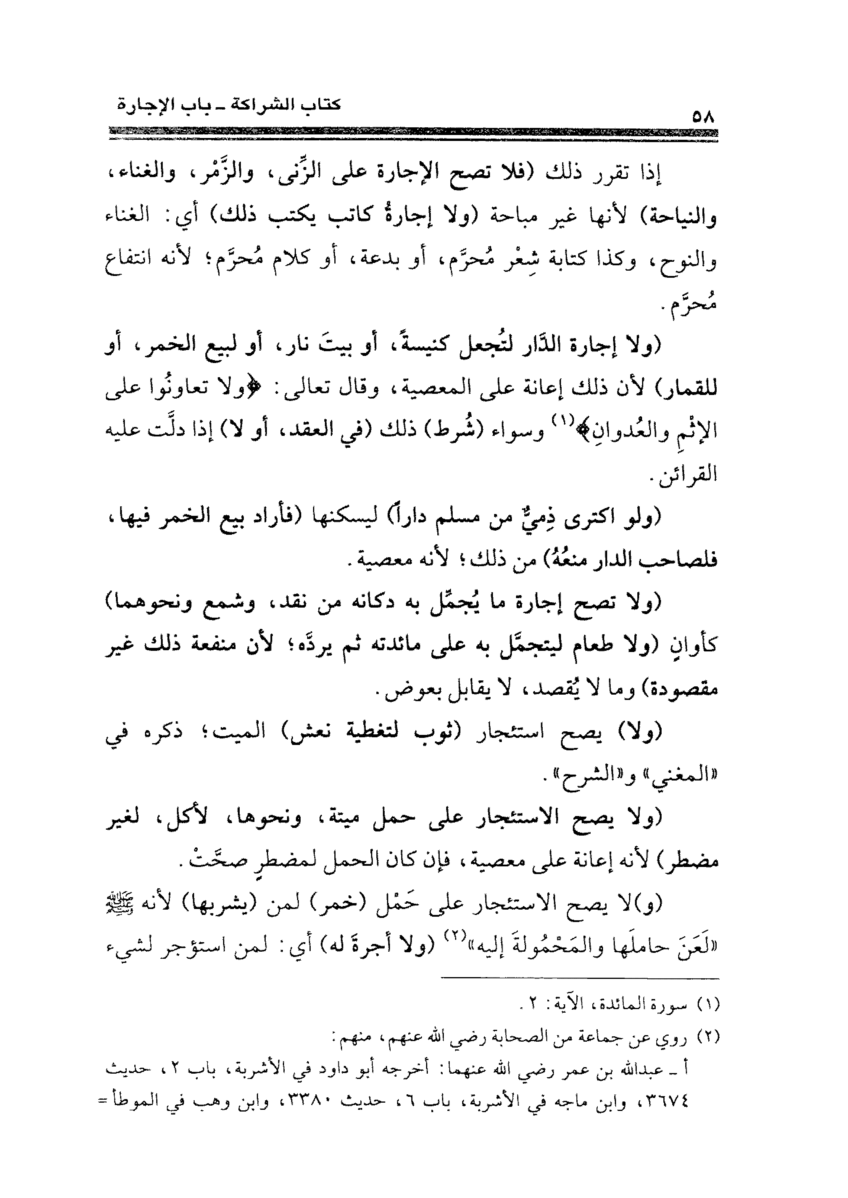 إذا تقرر ذلك (فلا تصح الإجارة على الزِّنى، والزَّمْر، والغناء، والنياحة) لأنها غير مباحة (ولا إجارةُ كاتب يكتب ذلك) أي: الغناء والنوح، وكذا كتابه شِعْر مُحرَّم، أو بدعة، أو كلام مُحرَّم؛ لأنه انتفاع مُحرَّم.