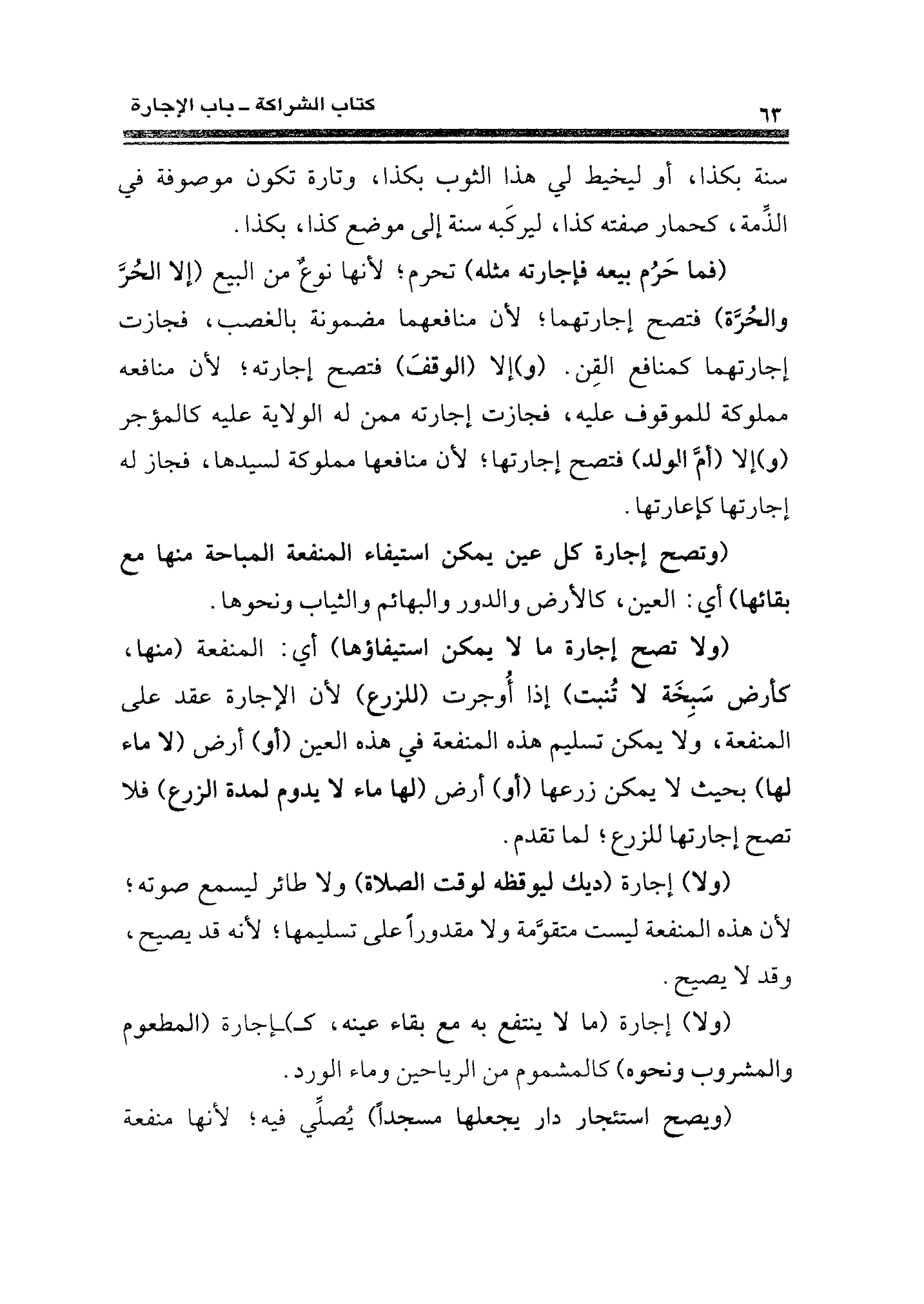 (فما حَرُم بيعه فإجارته مثله) تحرم؛ لأنها نوعٌ من البيع (إلا الحُرَّ والحُرَّة) فتصح إجارتهما؛ لأن منافعهما مضمونة بالغصب، فجازت إجارتهما كمنافع القِن. (و) إلا (الوقفَ) فتصبح إجارته؛ لأن منافعه مملوكة للموقوف عليه، فجازت إجارته ممن له الولاية عليه كالمؤجر (و) إلا (أمَّ الولد) فتصح إجارتها؛ لأن منافعها مملوكة لسيدها، فجاز له إجارتها كإعارتها.