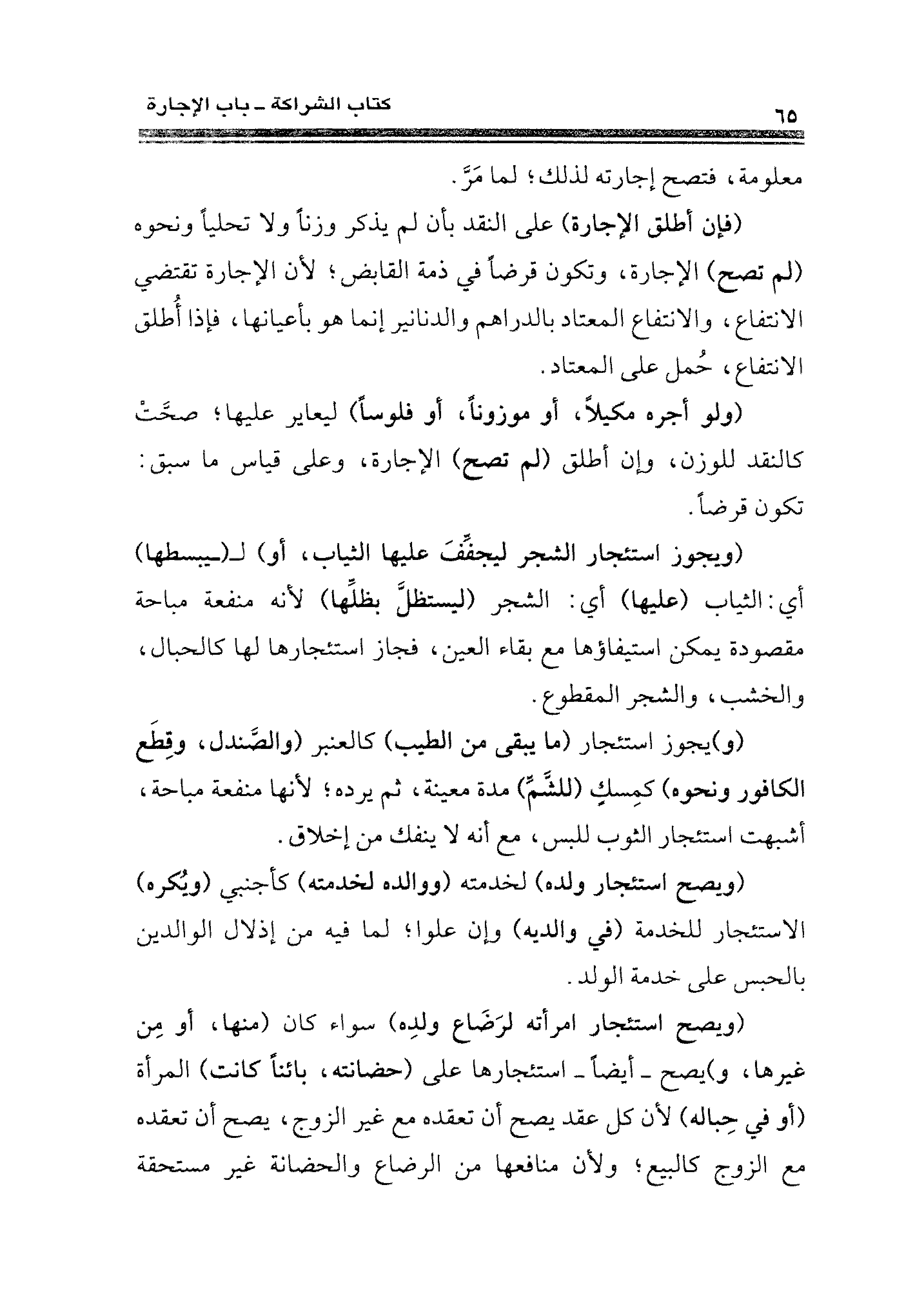 (فإن أطلق الإجارة) على النقد بأن لم يذكر وزنًا ولا تحليًّا ونحوه (لم تصح) الإجارة، وتكون قرضًا في ذمة القابض؛ لأن الإجارة تقتضي الانتفاع، والانتفاع المعتاد بالدراهم والدنانير إنما هو بأعيانها، فإذأ أُطلق الانتفاع، حُمل على المعتاد.